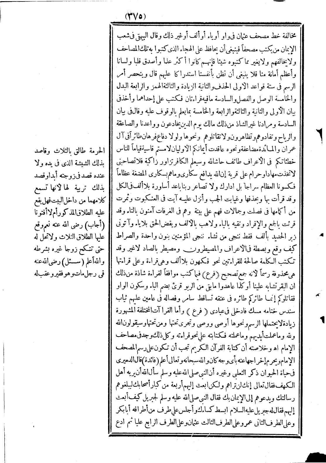 مخالفة خط مصحف عثمان في واو أو ياء أو ألف أو غير ذلك، وقال البيهقي في شعب الإيمان من يكتب مصحفا فينبغي أن يحافظ على الهجاء الذي كتبوا به تلك المصاحف ولا يخالفهم ولا يغير مما كتبوه شيئا؛ فإنهم كانوا أكثر علما وأصدق قلبا ولسانا، وأعظم أمانة منا، فلا ينبغي أن نظن بأنفسنا استدراكا عليهم، قال: وينحصر أمر الرسم في ستة قواعد؛ الأولى: الحذف، والثانية: الزيادة، والثالثة: الهمز، والرابعة: البدل، والخامسة: الوصل والفصل، والسادسة: ما فيه قراءتان، فكتب على إحداهما، وأخذ في بيان الأولى والثانية والثالثة والرابعة والخامسة بما يعلم بالوقوف عليه، وقال في بيان السادسة، ومرادنا غير الشاذ من ذلك:} مَالِكِ يَوْمِ الدِّينِ {،} يُخَادِعُونَ {، و} وَاعَدْنَا {، و} الصَّاعِقَةُ {، و} الرِّيَاحِ {، و} تُفَادُوهُمْ {، و} تَظَاهَرُونَ {، و} لَا تُقَاتِلُوهُمْ {، ونحوها، ولولا دفاع،} فَرِهَانٌ {، طائرا، في آل عمران والمائدة، مضاعفة ونحوه: عاقدت أيمانكم،} الْأَوْلَيَانِ {،} لَامَسْتُمُ {،} قَاسِيَة {،} قِيَاما لِلنَّاسِ {،} خَطِيئَاتِكُمْ {في الأعراف،} طَّائِفِ {،} حَاشَا لِلَّهِ {،} وَسَيَعْلَمُ {،} الْكَافِرِ {،} تَزَاوَرُ {، زاكية،} فَلَا تُصَاحِبْنِي {،} لَاتَّخَذْتَ {،} مِهَادا {، و} حَرَامٌ عَلَى قَرْيَةٍ {،} إِنَّ اللَّهَ يُدَافِعُ {،} سُكَارَى وَمَا هُمْ بِسُكَارَى {،} الْمُضْغَةَ عِظَاما فَكَسَوْنَا الْعِظَامَ {،} سِرَاجا {،} بَلِ ادَّارَكَ {، ولا تصاعر،} رَبَّنَا بَاعِدْ {، أساورة؛ بلا ألف في الكل، وقد قرأت بها وبحذفها: وغيابت الجب، وأنزل عليه آيت في العنكبوت، وثمرت من أكمامها في فصلت، وجمالات،} فَهُمْ عَلَى بَيِّنَةٍ {، وهم في الغرفات آمنون بالتاء، وقد قرئت بالجمع والإفراد، وتقيه بالياء ولأهب بالألف، ويقض الحق بلا ياء، و} آتُونِي زُبَرَ الْحَدِيدِ {بألف فقط، ننجي من نشاء،} نُنْجِي الْمُؤْمِنِينَ {بنون واحدة، و} الصِّرَاطَ {كيف وقع، بصطة في الأعراف، والمصيطرون، ومصيطر بالصاد لا غير، وقد تكتب الكلمة صالحة للقراءتين نحو: فكهون بلا ألف وهي قراءة، وعلى قراءتها هي محذوفة رسما؛ لأنه جمع تصحيح.