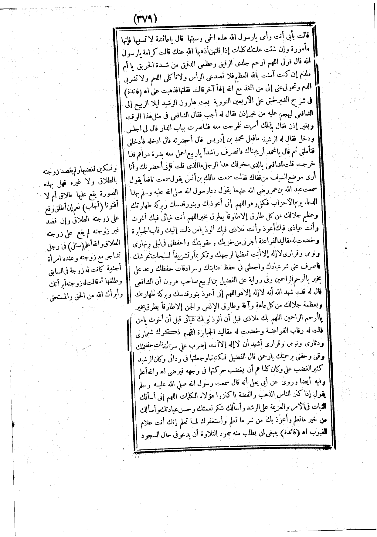 (فائدة) في شرح الشبرخيتي على الأربعين النووية، بعث هارون الرشيد ليلا إلى الشافعي ليهجم عليه من غير إذن، فقال له: أجب، فقال الشافعي: في مثل هذا الوقت وبغير إذن، فقال: بذلك أمرت، فخرجت معه فلما صرت بباب الدار قال لي: اجلس ودخل، فقال له الرشيد: ما فعل محمد بن إدريس، قال: أحضرته، قال: ادخله فأدخلني فتأملني، ثم قال: يا محمد أرعبناك، فانصرف راشدا يا ربيع احمل معه بدرة دراهم؛ فلما خرجت، قلت للشافعي: بالذي سخر لك هذا الرجل ما الذي قلت؟ فإني أحضرتك وأنا أرى موضع السيف من قفاك، فقلت: سمعت مالك بن أنس يقول: سمعت نافعا يقول: سمعت عبد الله بن عمر رضي الله عنهما يقول: دعا رسول الله صلى الله عليه وسلم بهذا الدعاء يوم الأحزاب فكفي، وهو اللهم إني أعوذ بك، وبنور قدسك، وبركة طهارتك، وعظيم جلالك من كل طارق إلا طارقا يطرق بخير، اللهم أنت غياثي فبك أغوث، وأنت عياذي فبك أعوذ، وأنت ملاذي فبك ألوذ، يا من ذلت إليك رقاب الجبابرة، وخضعت له مقاليد الفراعنة، أجرني من خزيك وعقوبتك، واحفظني في ليلي ونهاري، ونومي وقراري، لا إله إلا أنت تعظيما لوجهك، وتكريما وتشريفا لسبحات عرشك، فاصرف عني شر عبادك، واجعلني في حفظ عنايتك، وسرادقات حفظك وعد علي بخير يا أرحم الراحمين، وفي رواية عن الفضيل بن الربيع صاحب هارون أن الشافعي، قال له: قلت: شهد الله أنه لا إله إلا هو، اللهم إني أعوذ بنور قدسك، وبركة طهارتك، وبعظمة جلالك من كل عاهة وآفة وطارق الإنس والجن إلا طارقا يطرق بخير يا أرحم الراحمين، اللهم بك ملاذي قبل أن ألوذ، وبك غياثي قبل أن أغوث يا من ذلت له رقاب الفراعنة، وخضعت له مقاليد الجبابرة اللهم ذكرك شعاري ودثاري، ونومي وقراري، أشهد أن لا إله إلا أنت اضرب علي سرادقات حفظك، وقني وحفني برحمتك يا رحمن، قال الفضيل: فكتبتها وجعلتها في ردائي، وكان الرشيد كثير الغضب علي، وكان كلما هم أن يغضب حركتها في وجهه فيرضى. اهـ، والله أعلم.