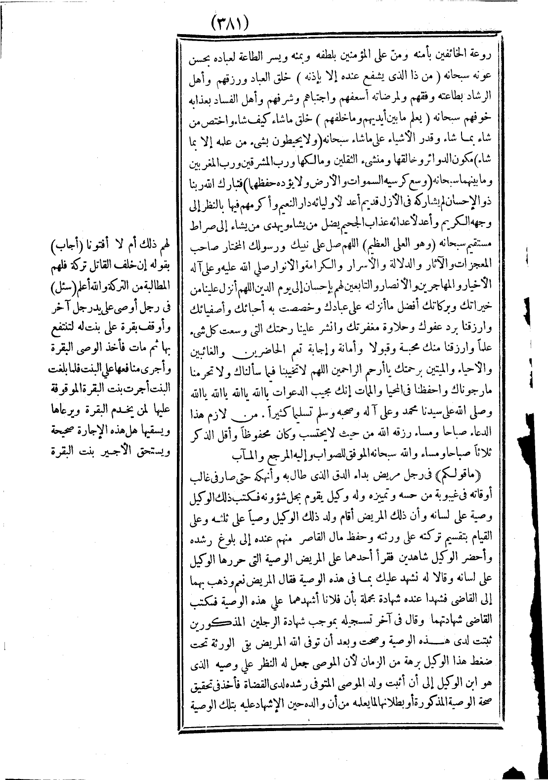 (ما قولكم) في رجل مريض بداء الدق الذي طال به، وأنهكه حتى صار في غالب أوقاته في غيبوبة من حسه وتمييزه، وله وكيل يقوم بحل شئونه فكتب ذلك الوكيل وصية على لسانه، وأن ذلك المريض أقام ولد ذلك الوكيل وصيا على ثلثه، وعلى القيام بتقسيم تركته على ورثته، وحفظ مال القاصر منهم عنده إلى بلوغ رشده، وأحضر الوكيل شاهدين فقرأ أحدهما على المريض الوصية التي حررها الوكيل على لسانه، وقالا له نشهد عليك بما في هذه الوصية، فقال المريض: نعم، وذهب بهما إلى القاضي فشهدا عنده شهادة مجملة، بأن فلانا أشهدهما على هذه الوصية، فكتب القاضي شهادتهما، وقال في آخر تسجيله بموجب شهادة الرجلين المذكورين ثبتت لدي هذه الوصية، وصحت، وبعد أن توفى اللهُ المريضَ بقي الورثة تحت ضغط هذا الوكيل برهة من الزمان؛ لأن الموصي جعل له النظر على وصيه الذي هو ابن الوكيل إلى أن أثبت ولد الموصي المتوفى رشده لدى القضاة؛ فأخذ في تحقيق صحة الوصية المذكورة، أو بطلانها لما يعلمه من أن والده حين الإشهاد عليه بتلك الوصية
