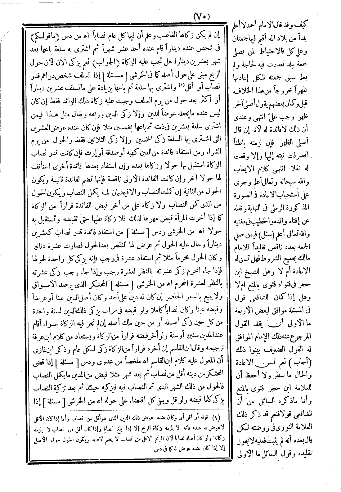 إذا تسلف شخص دراهم قدر نصاب أو أقل (¬1) واشترى بها سلعة ثم باعها بزيادة على ما تسلف عشرين دينارا أو أكثر بعد حول من يوم السلف وجبت عليه زكاة ذلك الزائد فقط إن كان ليس عنده ما يجعله عوضًا للدين وإلا زكى الدين وربحه، ويقال مثل هذا فيمن اشترى سلعة بعشرين في ذمته ثم باعها بخمسين مثلا فإن كان عنده عوض العشرين التي اشترى بها السلعة زكى الخمسين وإلا زكى الثلاثين فقط، والحول من يوم الشراء، ومن استفاد فائدة من العين كهبة أو صدقة أو إرث فإن كانت قدر نصاب الزكاة استقبل بها حولا وزكاها بعده وإن استفاد بعدها فائدة أخرى استأنف لها حولا آخر، وإن كانت الفائدة الأولى ناقصة فإنها تضم لفائدة ثانية ويكون الحول من الثانية إن كملت النصاب، وإلا فيضمان لما يكمل النصاب ويكون الحول من الذي كمل النصاب، ولا زكاة على من أخر قبض الفائدة فرارًا من الزكاة كما إذا أخرت المرأة قبض مهرها لذلك فلا زكاة عليها تقبضه وتستقبل به حولا. اهـ من الخرشي ودس.