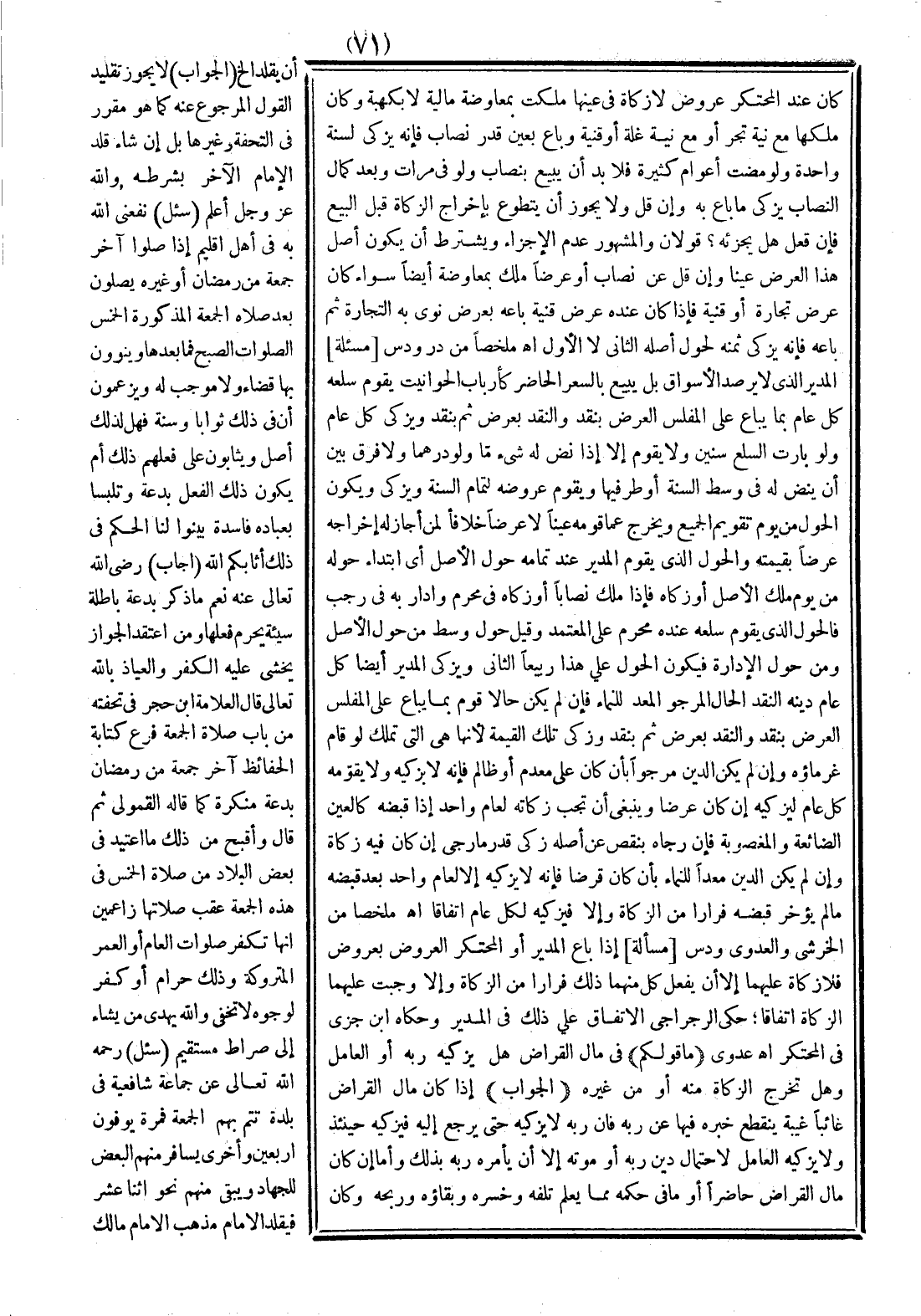 المدير الذي لا يرصد الأسواق، بل يبيع بالسعر الحاضر كأرباب الحوانيت يقوم سلعه كل عام بما يبيع على المفلس العرض بنقد، والنقد بعرض، ثم بنقد ويزكي كل عام ولو بارت السلع سنين ولا يقوم إلا إذا نض له شيء ما ولو درهما، ولا فرق بين أن ينض له في وسط السنة، أو طرفيها ويقوم عروضه لتمام السنة ويزكي ويكون الحول من يوم تقويم الجميع ويخرج عما قومه عينًا لا عرضًا خلافًا لمن أجاز له إخراجه عرضًا بقيمته، والحول الذي يقوم المدير عند تمامه حول الأصل أي ابتداء حوله من يوم ملك الأصل، أو زكاه فإذا ملك نصابًا أو زكاه في محرم وأدار به في رجب فالحول الذي يقوم سلعة عنده محرم على المعتمد، وقيل حول وسط من حول الأصل، ومن حول الإدارة فيكون الحول على هذا ربيعًا الثاني، ويزكي المدير أيضًا كل عام دينه النقد الحال المرجو المعد للنماء، فإن لم يكن حالا قوم بما يباع على المفلس العرض بنقد والنقد بعرض، ثم بنقد وزكى تلك القيمة لأنها هي التي تملك لو قام غرماؤه، وإن لم يكن الدين مرجوًا بأن كان على معدم أو ظالم فإنه لا يزكيه ولا يقومه كل عام ليزكيه إن كان عرضا، وينبغي أن تجب زكاته لعام واحد إذا قبضه كالعين الضائعة والمغصوبة فإن رجاه بنقص عن أصله زكى قدر ما رجى إن كان فيه زكاة وإن لم يكن الدين معدًا للنماء بأن كان قرضًا، فإنه لا يزكيه إلا لعام واحد بعد قبضه ما لم يؤخر قبضه فرارا من الزكاة وإلا فيزكيه لكل عام. اهـ ملخصًا من الخرشي والعدوي ودس.