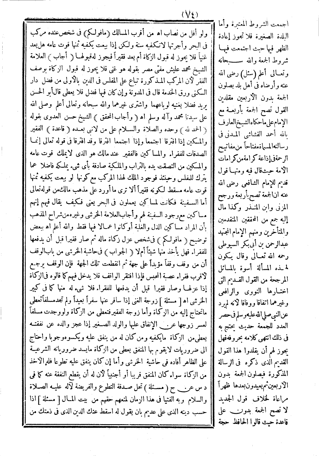 (أجاب) العلامة الشيخ محمد عليش مفتي مصر بقوله: هو غني فلا يجوز له قبول الزكاة بوصف الفقر؛ لأن المركب المذكورة تباع على المفلس في الدين بالأولى من فضل دار السكنى ورق الخدمة، قال في المدونة: وإن كان فيها فضل فلا يعطى، قال أبو الحسن: يريد فضلا يغنيه لو باعها واشترى غيرهما، والله سبحانه وتعالى أعلم وصلى الله على سيدنا محمد وآله وسلم. اهـ.