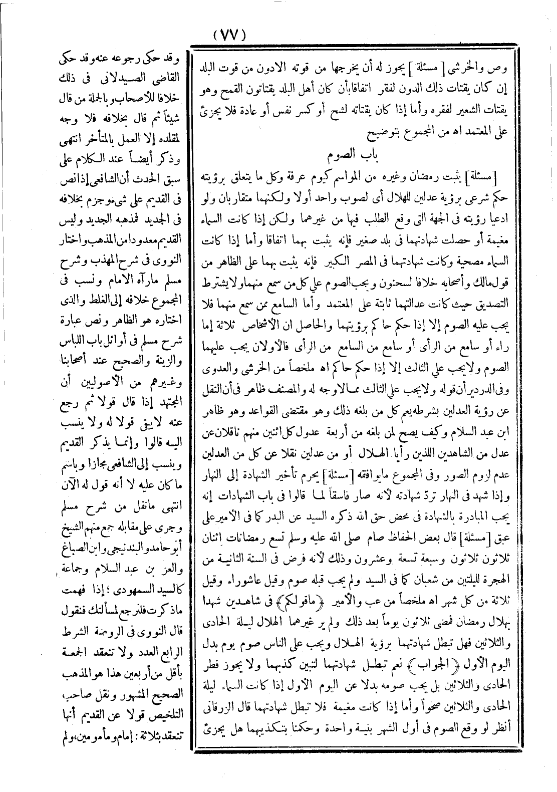يثبت رمضان وغيره من المواسم كيوم عرفة وكل ما يتعلق برؤيته حكم شرعي برؤية عدلين للهلال، أي لصوب واحد أولا ولكنهما متقاربان ولو ادعيا لرؤيته في الجهة التي وقع الطلب فيها من غيرهما، ولكن إذا كانت السماء مغيمة أو حصلت شهادتهما في بلد صغير فإنه يثبت بهما اتفاقًا، وأما إذا كانت السماء مصحية وكانت شهادتهما في المصر الكبير؛ فإنه يثبت بهما على الظاهر من قول مالك وأصحابه خلافًا لسحنون، ويجب الصوم على كل من سمع منهما، ولا يشترط التصديق حيث كانت عدالتهما ثابتة على المعتمد، وأما السامع ممن سمع منهما فلا يجب عليه الصوم إلا إذا حكم حاكم برؤيتهما، والحاصل أن الأشخاص ثلاثة، إما راء أو سامع من الرائي، أو سامع من السامع من الرائي، فالأولان يجب عليهما الصوم، ولا يجب على الثالث، إلا إذا حكم حاكم. اهـ ملخصًا من الخرشي والعدوي، وفي الدردير أن قوله ولا يجب على الثالث مما لا وجه له، والمصنف ظاهر في أن النقل عن رؤية العدلين بشرطه يعم كل من بلغه ذلك، وهو مقتضى القواعد وهو ظاهر ابن عبد السلام، وكيف يصح لمن بلغه من أربعة عدول كل اثنين منهم ناقلان عن عدل من الشاهدين اللذين رأيا الهلال أو من عدلين نقلا عن كل من العدلين عدم لزوم الصوم وفي المجموع ما يوافقه.