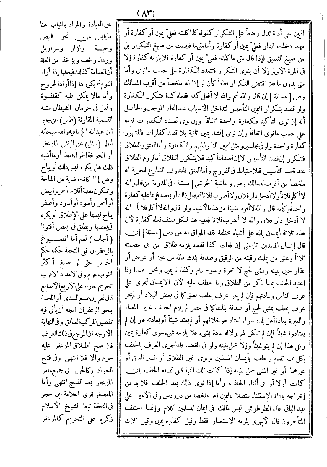 اليمين على أداة تدل وضعًا على التكرار كقوله: كلما كلمته فعلي يمين أو كفارة أو مهما دخلت الدار فعلي يمين أو كفارة وأما متى ما فليست من صيغ التكرار، بل من صيغ التعليق فإذا قال: متى ما كلمته فعلي يمين أو كفارة فلا يلزمه كفارة إلا في المرة الأولى إلا أن ينوي التكرار فتتعدد الكفارة على حسب ما نوى، وأما متى بدون ما فلا تقتضي التكرار قطعًا كأن لو إذا. اهـ ملخصًا من أقرب المسالك وص.