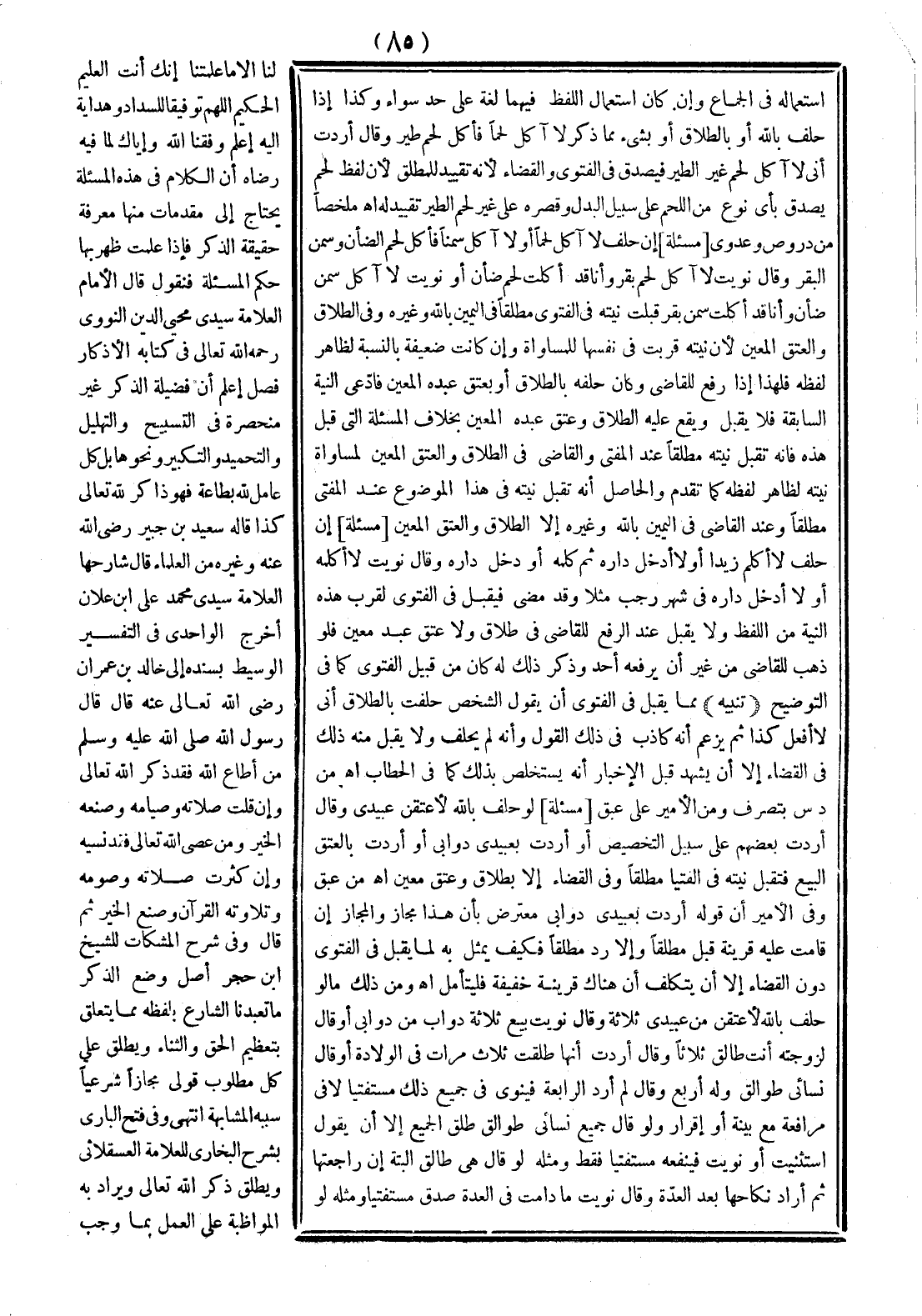 لو حلف بالله لأعتقن عبيدي وقال: أردت بعضهم على سبيل التخصيص أو أردت بعبيدي دوابي أو أردت بالعتق البيع فتقبل نيته في الفتيا مطلقًا وفي القضاء إلا بطلاق وعتق معين. اهـ من عبق وفي الأمير أن قوله أردت بعبيدي دوابي معترض بأن هذا مجاز والمجاز إن قامت عليه قرينة قبل مطلقًا، وإلا رد مطلقًا فكيف يمثل به لما يقبل في الفتوى دون القضاء إلا أن يتكلف أن هناك قرينة خفيفة فليتأمل. اهـ ومن ذلك ما لو حلف بالله لأعتقن من عبيدي ثلاثة وقال: نويت بيع ثلاثة دواب من دوابي، أو قال لزوجته: أنت طالق ثلاثًا، وقال: أردت أنها طلقت ثلاث مرات في الولادة، أو قال: نسائي طوالق وله أربع، وقال: لم أرد الرابعة فينوي في جميع ذلك مستفتيًا لا في مرافعة مع بينة أو إقرار، ولو قال: جميع نسائي طوالق طلق الجميع إلا أن يقول: استثنيت أو نويت فينفعه مستفتيًا فقط، ومثله لو قال: هي طالق البتة إن راجعتها ثم أراد نكاحها بعد العدة وقال: نويت ما دامت في العدة صدق مستفتيًا ومثله لو