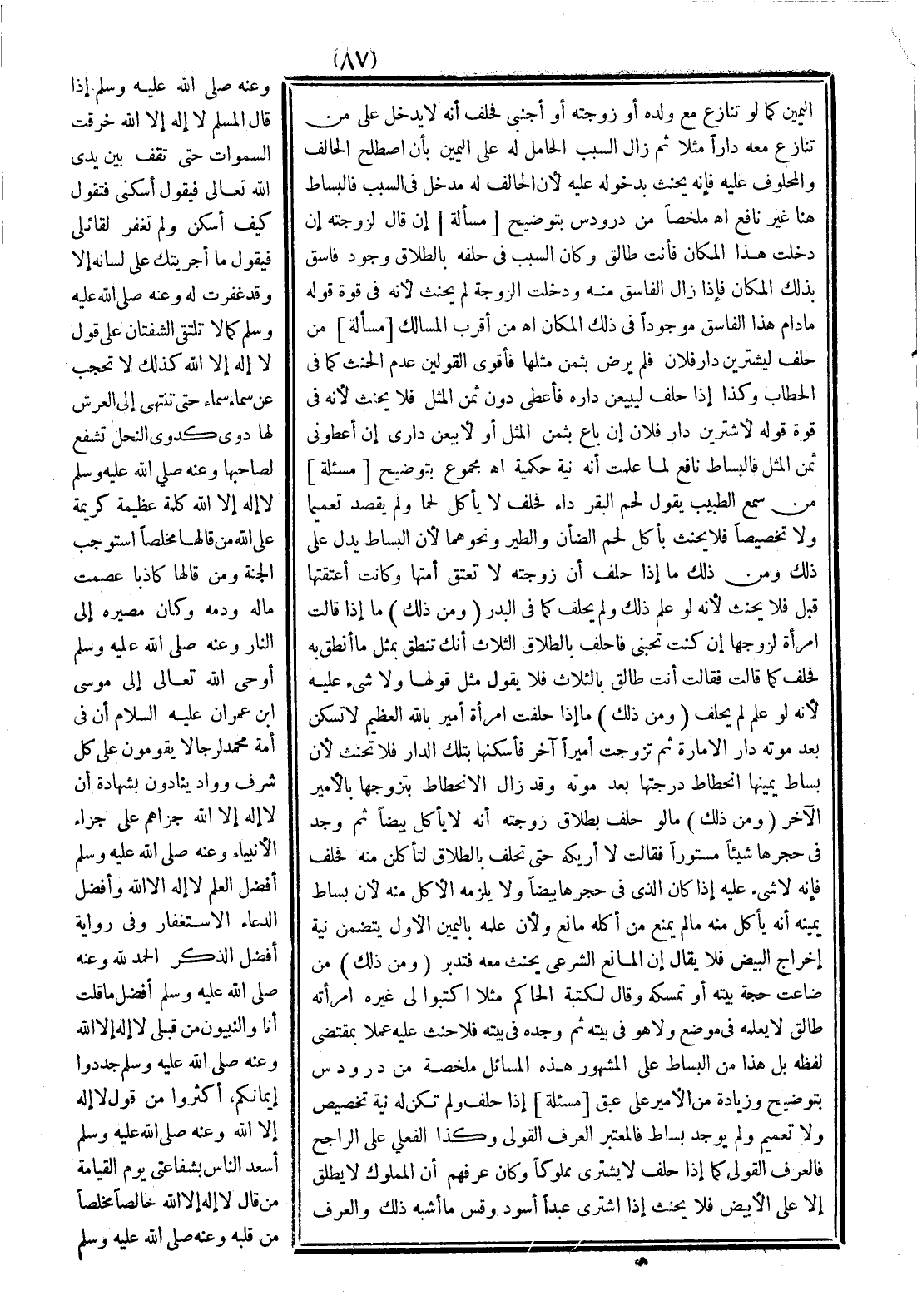 (ومن ذلك) ما لو حلف بطلاق زوجته أنه لا يأكل بيضًا ثم وجد في حجرها شيئًا مستورًا فقالت: لا أريكه حتى تحلف بالطلاق لتأكلن منه فحلف فإنه لا شيء عليه إذا كان الذي في حجرها بيضًا، ولا يلزمه الأكل منه؛ لأن بساط يمينه أنه يأكل منه ما لم يمنع من أكله مانع، ولأن علمه باليمين الأول يتضمن نية إخراج البيض فلا يقال: إن المانع الشرعي يحنث معد فتدبر.