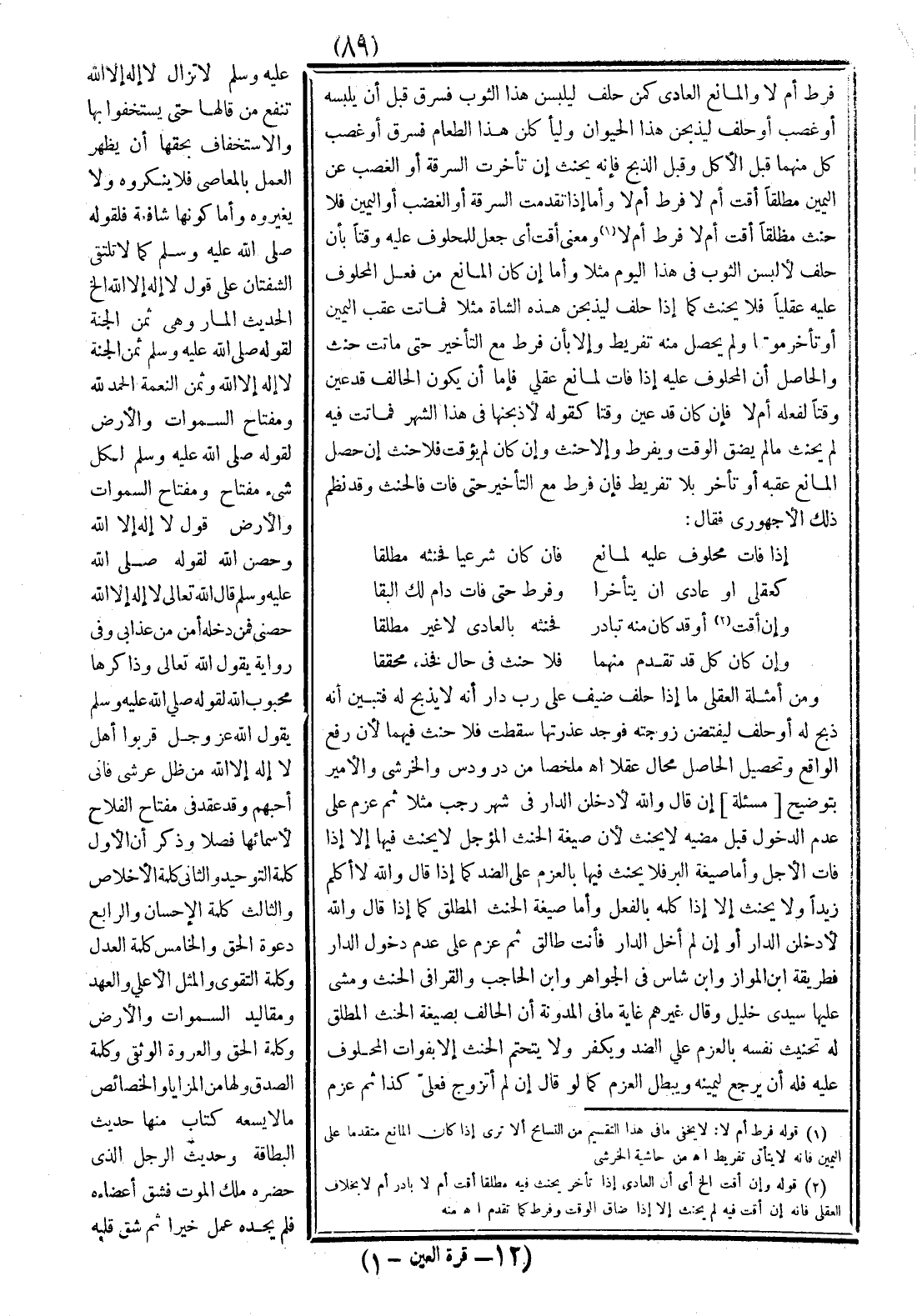 فرط أم لا والمانع العادي كمن حلف ليلبسن هذا الثوب فسرق قبل أن يلبسه أو غصب أو حلف ليذبحن هذا الحيوان وليأكلن هذا الطعام فسرق أو غصب كل منهما قبل الأكل، وقبل الذبح؛ فإنه يحنث إن تأخرت السرقة أو الغصب عن اليمين مطلقًا أقت أم لا فرط أم لا، وأما إذا تقدمت السرقة أو الغضب أو اليمين فلا حنث مطلقًا أقت أم لا فرط أم لا؟ (¬1) ومعني أقت أي جعل للمحلوف عليه وقتًا بأن حلف لألبسن الثوب في هذا اليوم مثلاً، وأما إن كان المانع من فعل المحلوف عليه عقليًا، فلا يحنث كما إذا حلف ليذبحن هذه الشاة مثلاً فماتت عقب اليمين أو تأخر موتها، ولم يحصل منه تفريط وإلا بأن فرط مع التأخير حتى ماتت حنث، والحاصل أن المحلوف عليه إذا فات لمانع عقلي، فإما أن يكون الحالف قد عين وقتًا لفعله أم لا فإن كان قد عين وقتًا كقوله: لأذبحنها في هذا الشهر فماتت فيه لم يحنث ما لم يضق الوقت، ويفرط وإلا حنث، وإن كان لم يؤقت فلا حنث إن حصل المانع عقبه، أو تأخر بلا تفريط فإن فرط مع التأخير حتى فات فالحنث وقد نظم ذلك الأجهوري فقال: