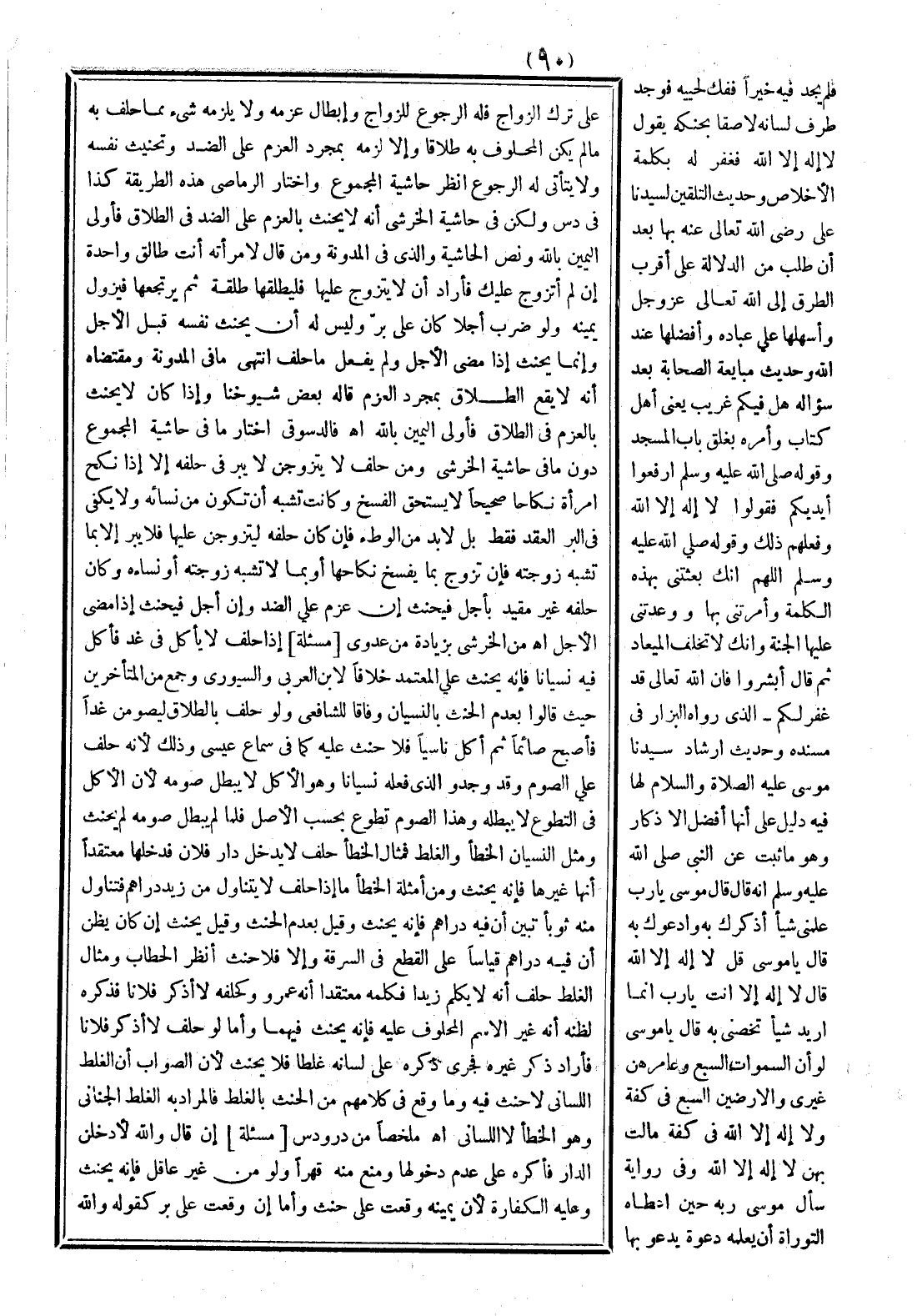 على ترك الزواج فله الرجوع للزواج، وإبطال عزمه ولا يلزمه شيء مما حلف به ما لم يكن المحلوف به طلاقًا وإلا لزمه بمجرد العزم على الضد، وتحنيث نفسه ولا يتأتى له الرجوع انظر حاشية المجموع، واختار الرماصي هذا الطريق كذا في دس، ولكن في حاشية الخرشي أنه لا يحنث بالعزم على الضد في الطلاق فأولى اليمين بالله، ونص الحاشية، والذي في المدونة ومن قال لامرأته: أنت طالق واحدة إن لم أتزوج عليك فأراد أن لا يتزوج عليها فليطلقها طلقة ثم يرتجعها فيزول يمينه ولو ضرب أجلاً كان على بر وليس له أن يحنث نفسه قبل الأجل وإنما يحنث إذا مضى الأجل، ولم يفعل ما حلف. انتهى ما في المدونة ومقتضاه أنه لا يقع الطلاق بمجرد العزم قاله بعض شيوخنا وإذا كان لا يحنث بالعزم في الطلاق فأولى اليمين بالله. اهـ فالدسوقي اختار ما في المجموع دون ما في حاشية الخرشي ومن حلف لا يتزوجن لا يبر في حلفه إلا إذا نكح امرأة نكاحًا صحيحًا لا يستحق الفسخ وكانت تشبه أن تكون من نسائه ولا يكفي في البر العقد فقط بل لا بد من الوطء فإن كان حلفه ليتزوجن عليها فلا يبر إلا بما تشبه زوجته، فإن تزوج بما يفسخ نكاحها أو بما لا تشبه زوجته أو نساءه وكان حلفه غير مقيد بأجل فيحنث إن عزم على الضد وإن أجل فيحنث إذا مضى الأجل. اهـ من الخرشي بزيادة من عدوي.