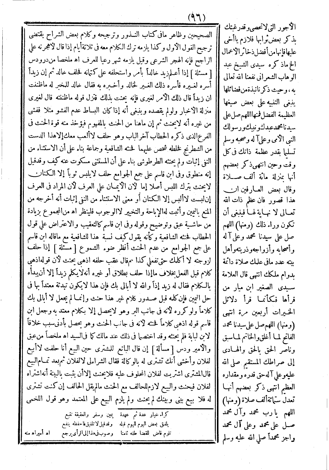 إن قال البائع للمشتري حين البيع أنا حلفت لا أبيع لفلان وأخشى أنك تشترى له بالوكالة فقال: الشراء لي لا لفلان ثم بعد تمام البيع قال المشتري: اشتريت لفلان المحلوف عليه فلا يحنث إلا أن يثبت بالبينة أنه اشتراه لفلان فيحنث والبيع لازم للحالف مع الحنث ما لم يقل الحالف: إن كنت تشتري له فلا بيع بيني وبينك، لم يحنث ولم يلزم البيع على المعتمد وهو قول اللخمي.