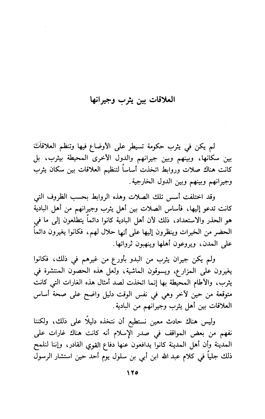 وليس هناك حادث معين نستطيع أن نتخذه دليلاً على ذلك، ولكننا نفهم من بعض المواقف في صدر الإسلام أنه كانت هناك غارات على المدينة وأن أهل المدينة كانوا يدافعون عنها دفاع القوي القادر، وإننا لنلمح ذلك جلياً في كلام عبد الله ابن أبي بن سلول يوم أحد حين استشار الرسول ...