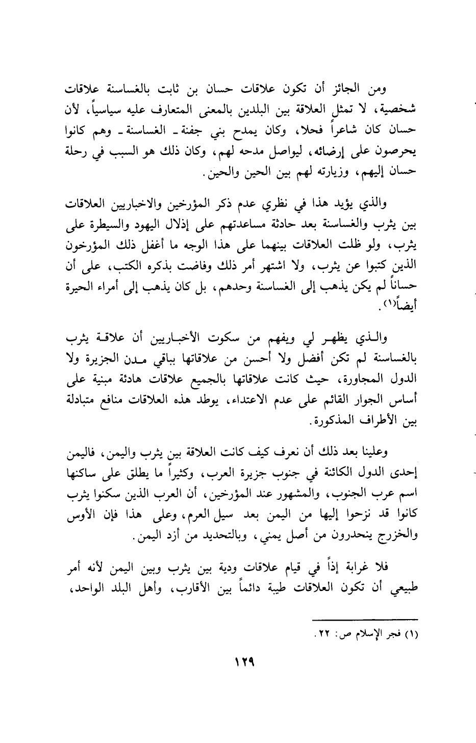 والذي يؤيد هذا في نظري عدم ذكر المؤرخين والإخباريين العلاقات بين يثرب والغساسنة بعد حادثة مساعدتهم على إذلال اليهود والسيطرة على يثرب، ولو ظلت العلاقات بينهما على هذا الوجه ما أغفل ذلك المؤرخون الذين كتبوا عن يثرب، ولا اشتهر أمر ذلك وفاضت بذكره الكتب، على أن حساناً لم يكن يذهب إلى الغساسنة وحدهم، بل كان يذهب إلى أمراء الحيرة أيضاً (1).