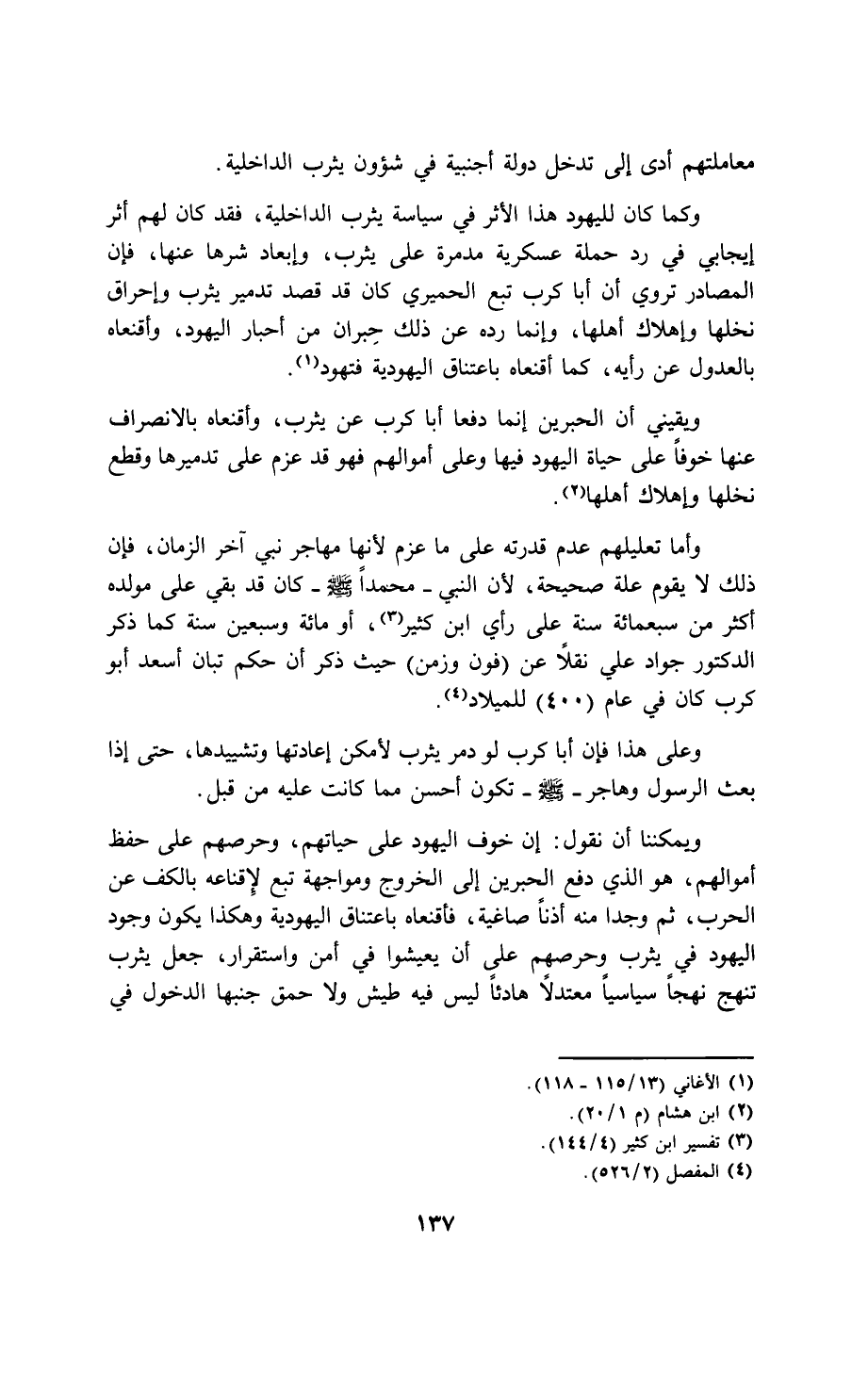 ويقيني أن الحبرين إنما دفعا أبا كرب عن يثرب، وأقنعاه بالإنصراف عنها خوفاً على حياة اليهود فيها وعلى أموالهم فهو قد عزم على تدميرها وقطع نخلها وإهلاك أهلها (2).