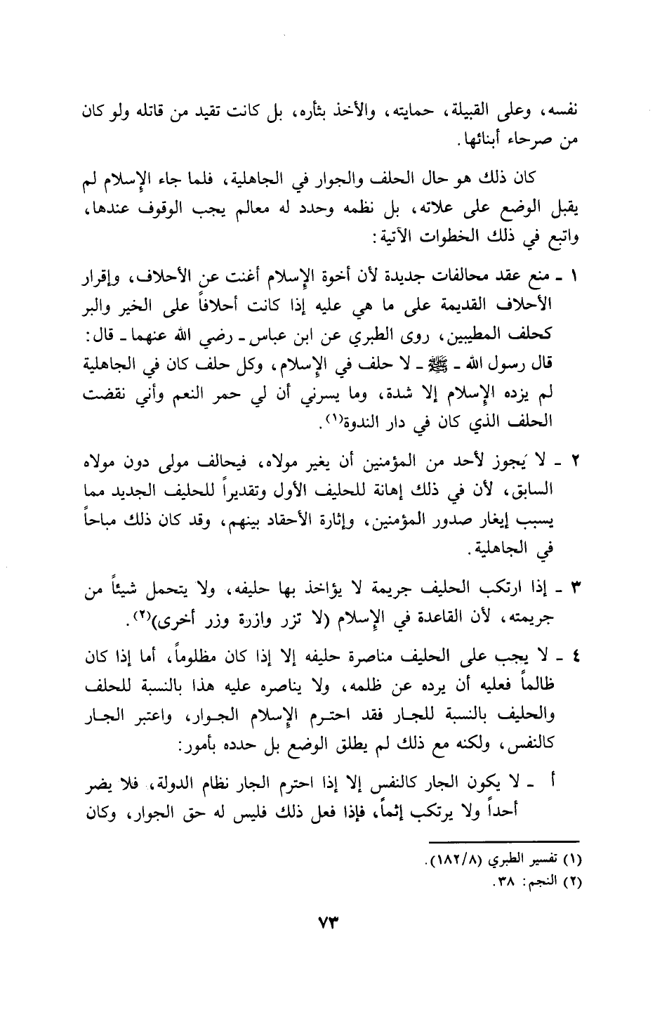 1 - منع عقد محالفات جدتدة لأن أخوة الإسلام أغنت عن الأحلاف، وإقرار