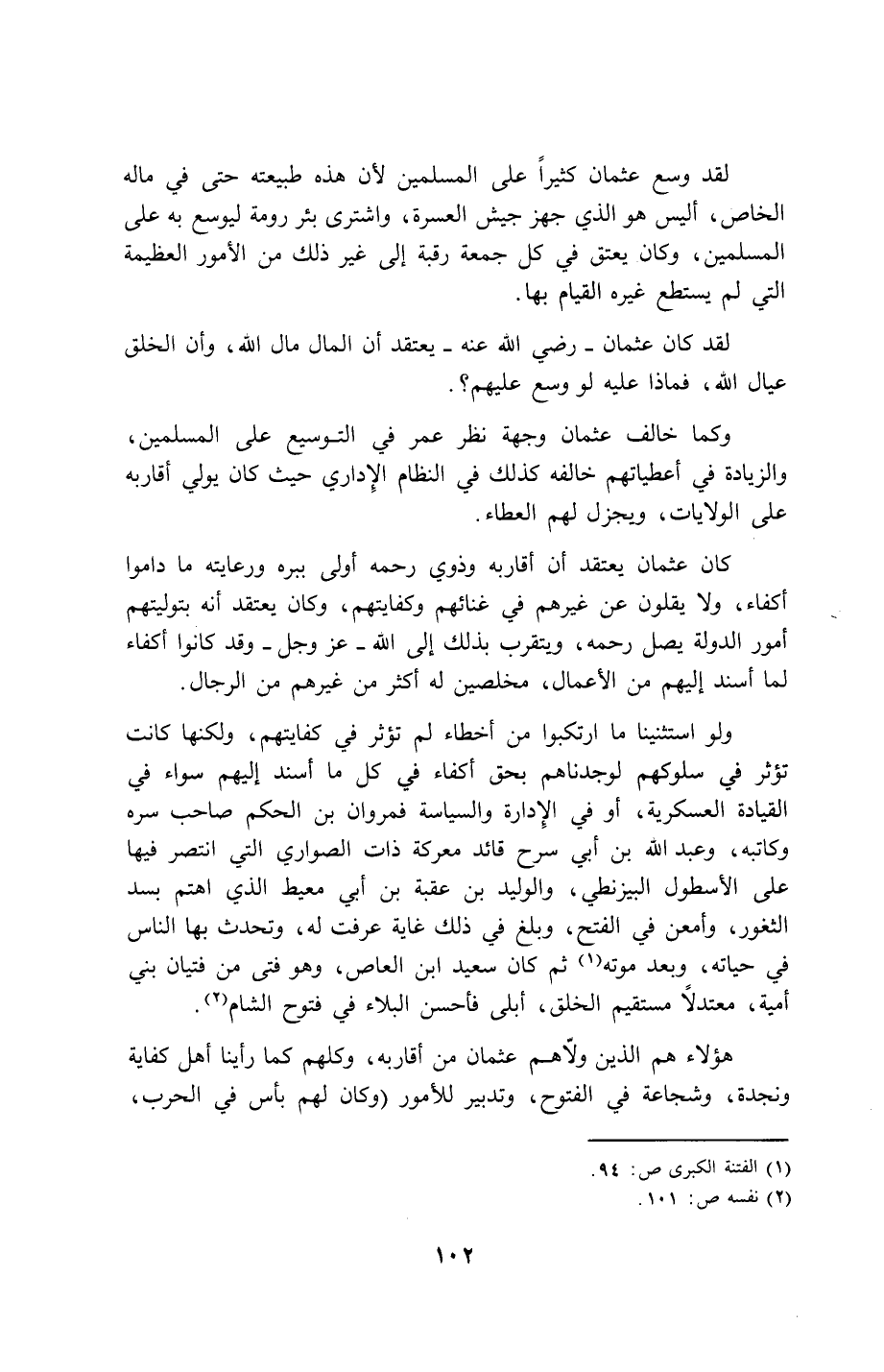 102…لقد وسع عثمان كثيراً على المسلمين لأن هذه طبيعته حتى في ماله الخاص، أليس هو الذي جهز جيش العسرة، واشترى بئر رومة ليوسع به على المسلمين، وكان يعتق في كل جمعة رقبة إلى غير ذلك من الأمور العظيمة التي لم يستطع غيره القيام بها.