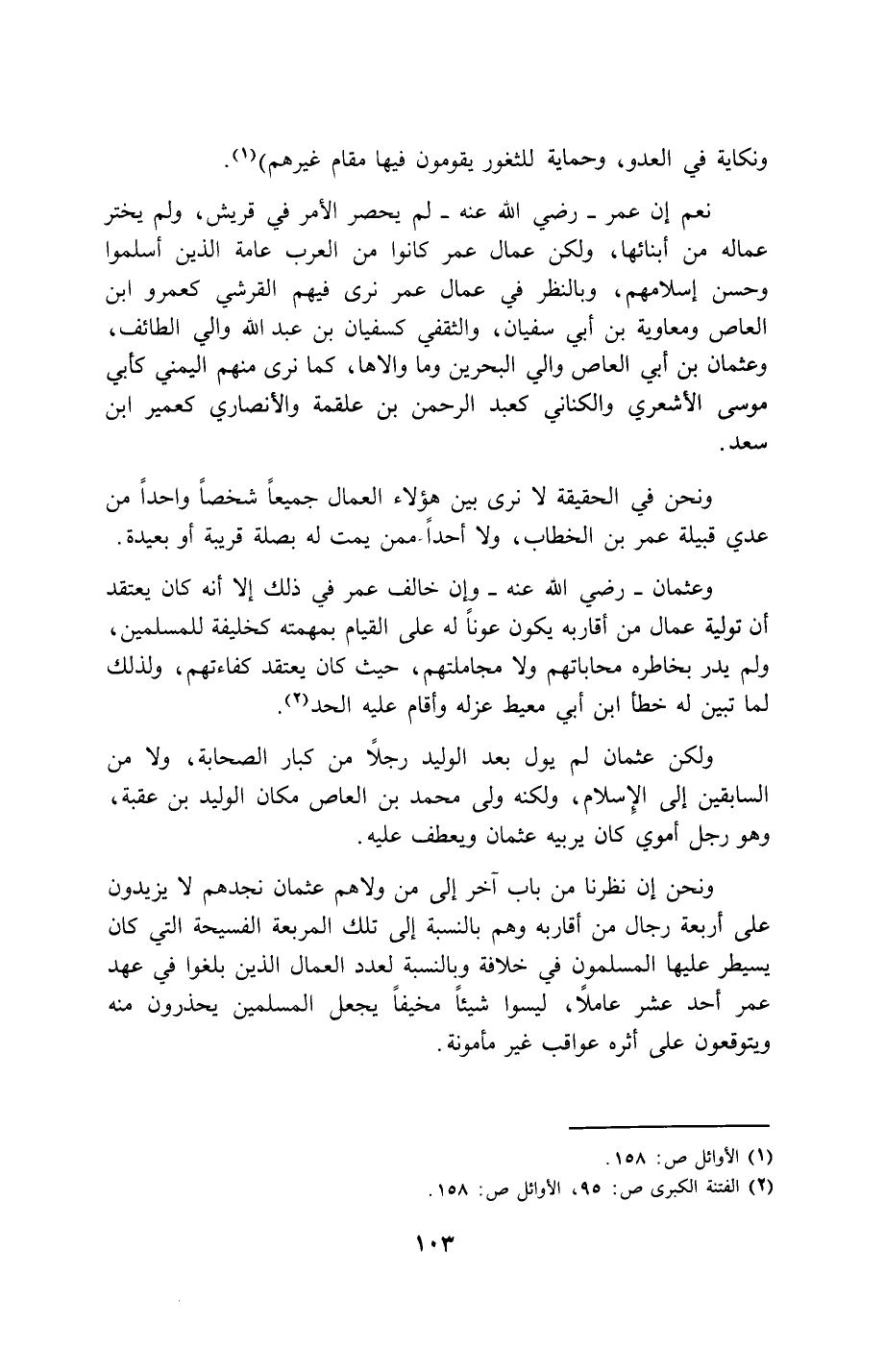 ونحن إن نظرنا من باب آخر إلى من ولاهم عثمان نجدهم لا يزيدون على أربعة رجال من اقاربه وهم بالنسبة إلى تلك النربعة الفسيحة التي كان يسيطر عليها المسلمون في خلافة وبالنسبة لعدد العمال الذين بلغوا في عهد عمر أحد عشر عاملاً، ليسوا شيئاً مخيفاً يجعل المسلمين يحذرون منه ويتوقعون على أثره عواقي غير مأمونة.