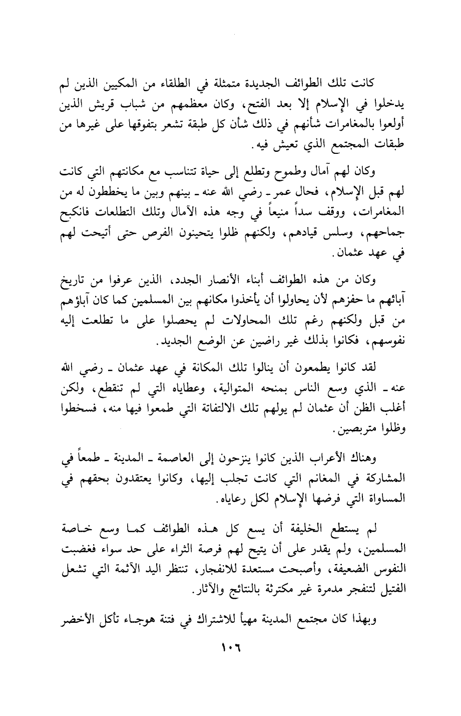106…كانت تلك الطوائف الجديدة متمثلة في الطلقاء من المكيين الذين لم يدخلوا في الإسلام إلا بعد الفتح، وكان معظمهم من شباب قريش الذين أولعوا بالمغامرات شأنهم في ذلك كل طبقة تشعر بتفوقها على غيرها من طبقات المجتمع الذي تعيش فيه.