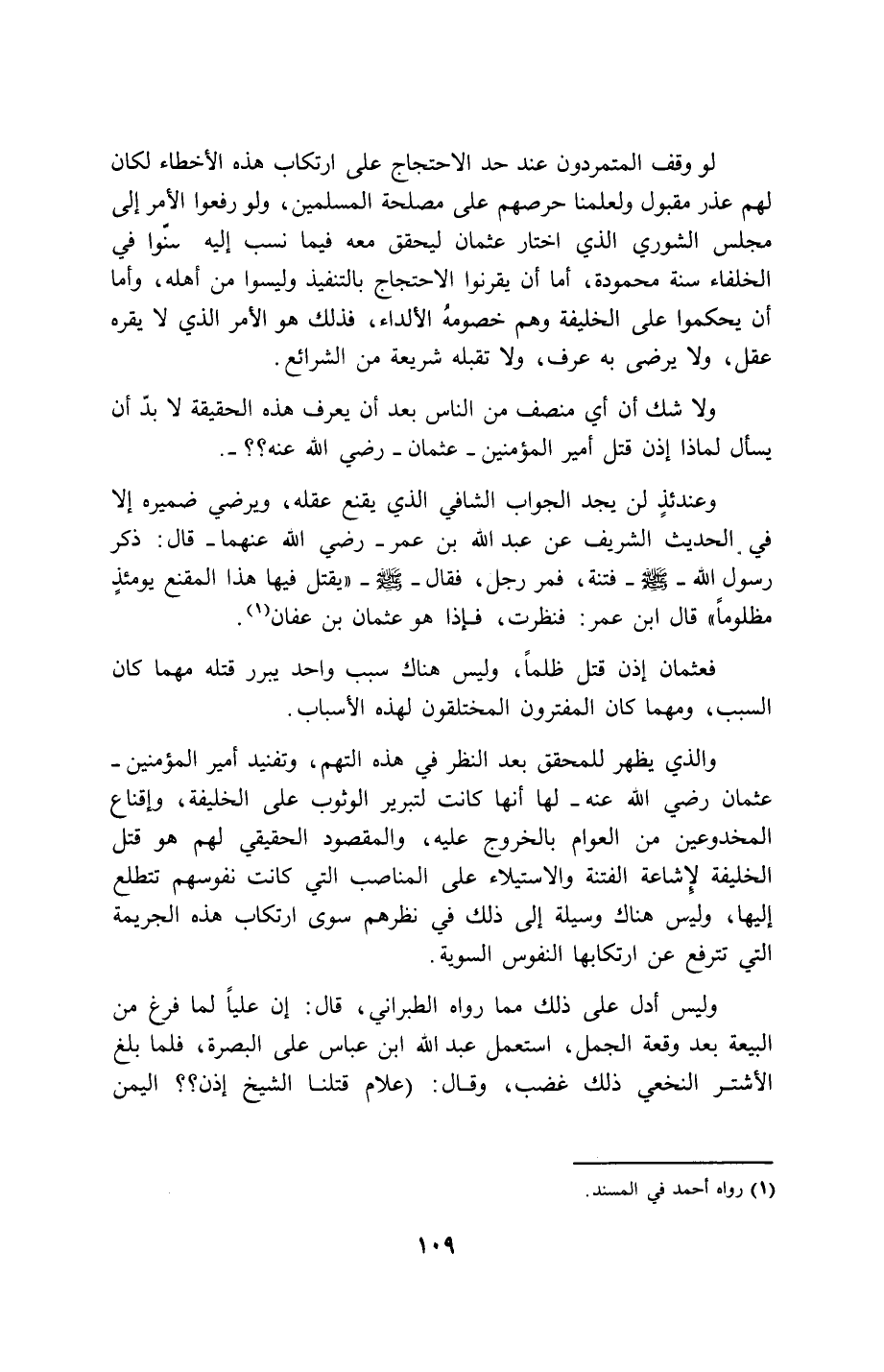 109…لو وقف المتمردون عند حد الاحتجاج على ارتكاب هذه الأخطاء لكان لهم عذر مقبول ولعلمنا حرصهم على مصلحة المسلمين، ولو رفعوا الأمر إلى مجلس الشوري الذي اختار عثمان ليحقق معه فيما نسب إليه سنّوا في الخلفاء سنة محمودة، أما أن يقرنوا الاحتجاج بالتنفيذ وليسوا من أهله، وأما أن يحكموا على الخليفة وهم خصومهُ اللداء، فذلك هو الأمر الذي لا يقره عقل، ولا يرضى به عرف، ولا تقبله شريعة من الشرائع.
