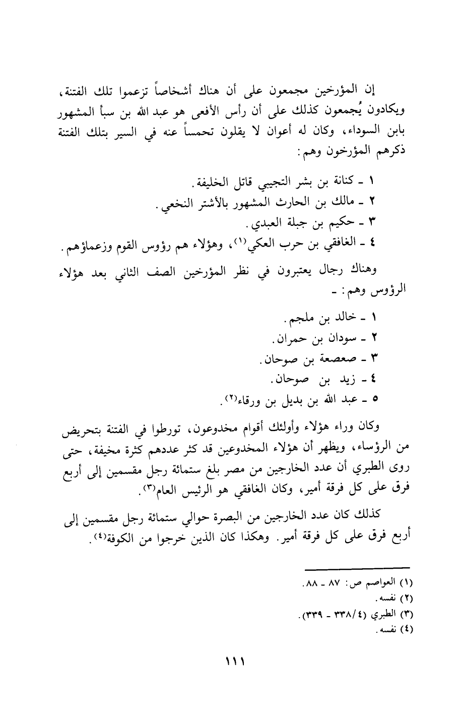 111…إن المؤرخين مجمعون على أن هناك أشخاصاً تزعموا تلك الفتنة، ويكادون يُجمعون كذلك على أن رأس الأفعى هو عبد الله بن سبأ المشهور بابن السوداء، وكان له أعوان لا يقلون تحمساً عنه في السير بتلك الفتنة ذكرهم المؤرخون وهم: