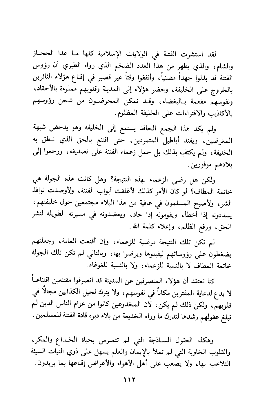 112…لقد استشرت الفتنة في الولايات الإسلامية كلها عدا الحجاز والشام، والذي يظهر من هذا العدد الضخم الذي رواه الطبري أن رؤوس الفتنة قد بذلوا جهداً مضنياً، وأنفقوا وقتاً غير قصير في إقناع هؤلاء الثائرين بالخروج على الخليفة، وحضر هؤلاء إلى المدينة وقلوبهم مملوءة بالأحقاد، ونفوسهم مفعمة بالبغضاء، وقد تمكن المحرضون من شحن رؤوسهم بالأكاذيب والافتراءات على الخليفة المظلوم.