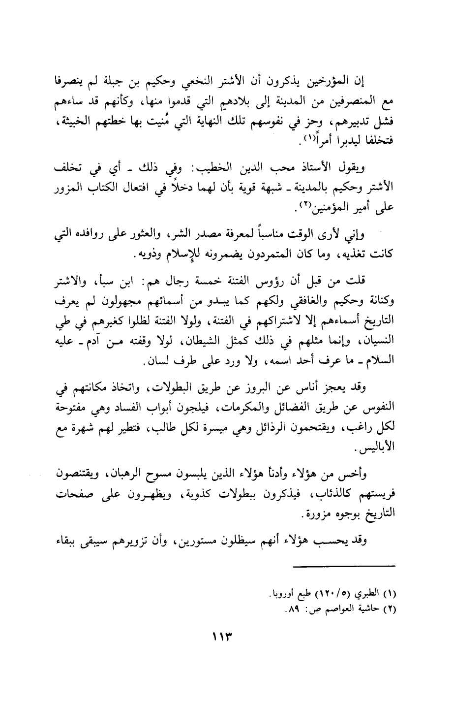 ويقول الأستاذ محب الدين الخطيب: وفي ذلك - أي في تخلف الأشتر وحكيم بالمدينة - شبهة قوية بأن لهما دخلاً في افتعال الكتاب المزور على أمير المؤمنين (2).