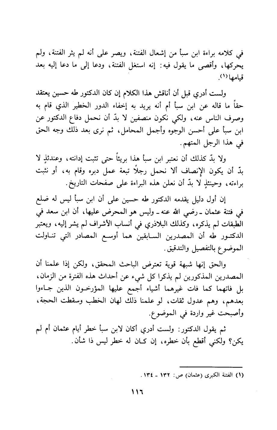 116…في كلامه براءة ابن سبأ من إشعال الفتنة، ويصر على أنه لم يثر الفتنة، ولم يحركها، وأقصى ما يقول فيه: إنه استغل الفتنة، ودعا إلى ما دعا إليه بعد قيامها (1).