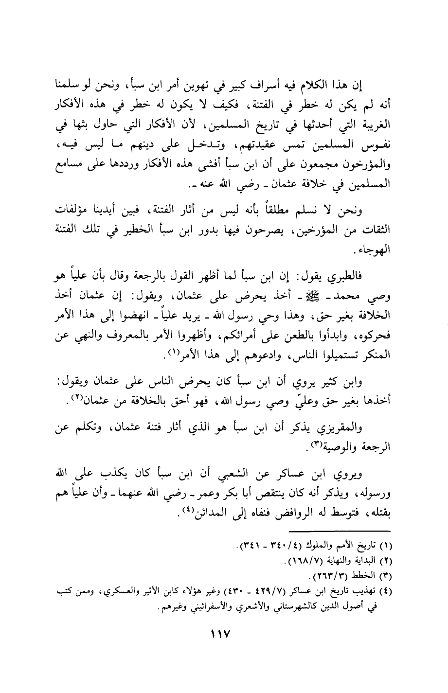 117…إن هذا الكلام فيه اسراف كبير في تهوين أمر ابن سبأ، ونحن لو سلمنا أنه لم يكن له خطر في الفتنة، فكيف لا يكون له خطر في هذه الأفكار الغريبة التي أحدثها في تاريخ المسلمين، لأن الأفكار التي حاول بثها في نفوس المسلمين تمس عقيدتهم، وتدخل على دينهم ما ليس فيه، والمؤرخون مجتمعون على أن ابن سبأ أفشى هذه الأفكار ورددها على مسامع المسلمين في خلافة عثمان -رضي الله عنه-.