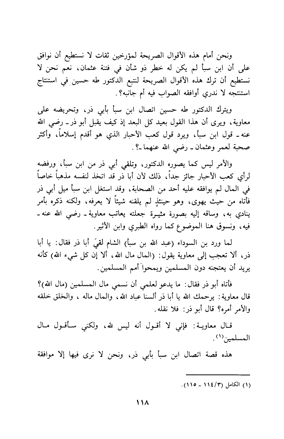 118…ونحن أمام هذه الأقوال الصريحة لمؤرخين ثقات لا نستطيع أن نوافق على أن ابن سبأ لم يكن له خطر ذو شأن في فتنة عثمان، نعم نحن لا نستطيع أن ترك هذه الأقوال الصريحة لتتبع الدكتور طه حسين في استنتاج استنتجه لا ندري أوافقه الصواب فيه أم جانبه؟.