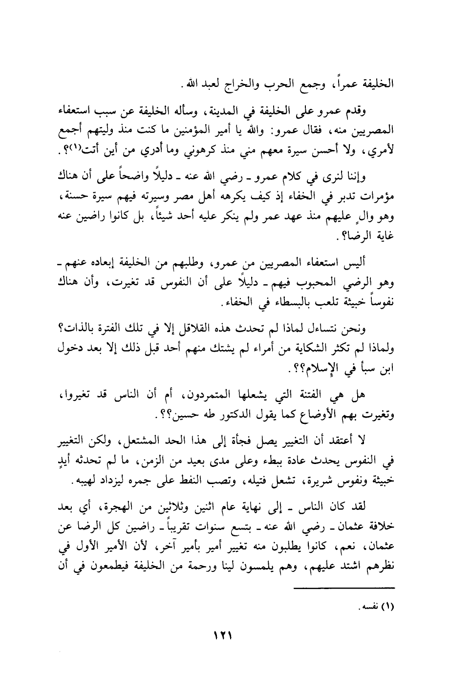 أليس استعفاء المصريين من عمرو، وطلبهم من الخليفة إبعاده عنهم - وهو الرضي المحبوب فيهم - دليلاً على أن النفوس قد تغيرت، وأن هناك نفوساً خبيثة تلعب بالبسطاء في الخفاء.