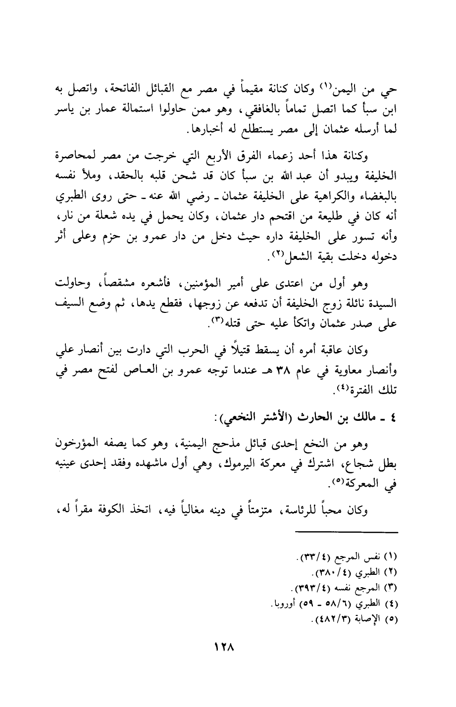 128…حي من اليمن (1) وكان كنانة مقيماً في مصر مع القبائل الفاتحة، واتصل به ابن سبأ كما اتصل تماماً بالغافقي، وهو ممن حاولوا استمالة عمار بن ياسر لما أرسله عثمان إلى مصر يستطلع له اخبارها.