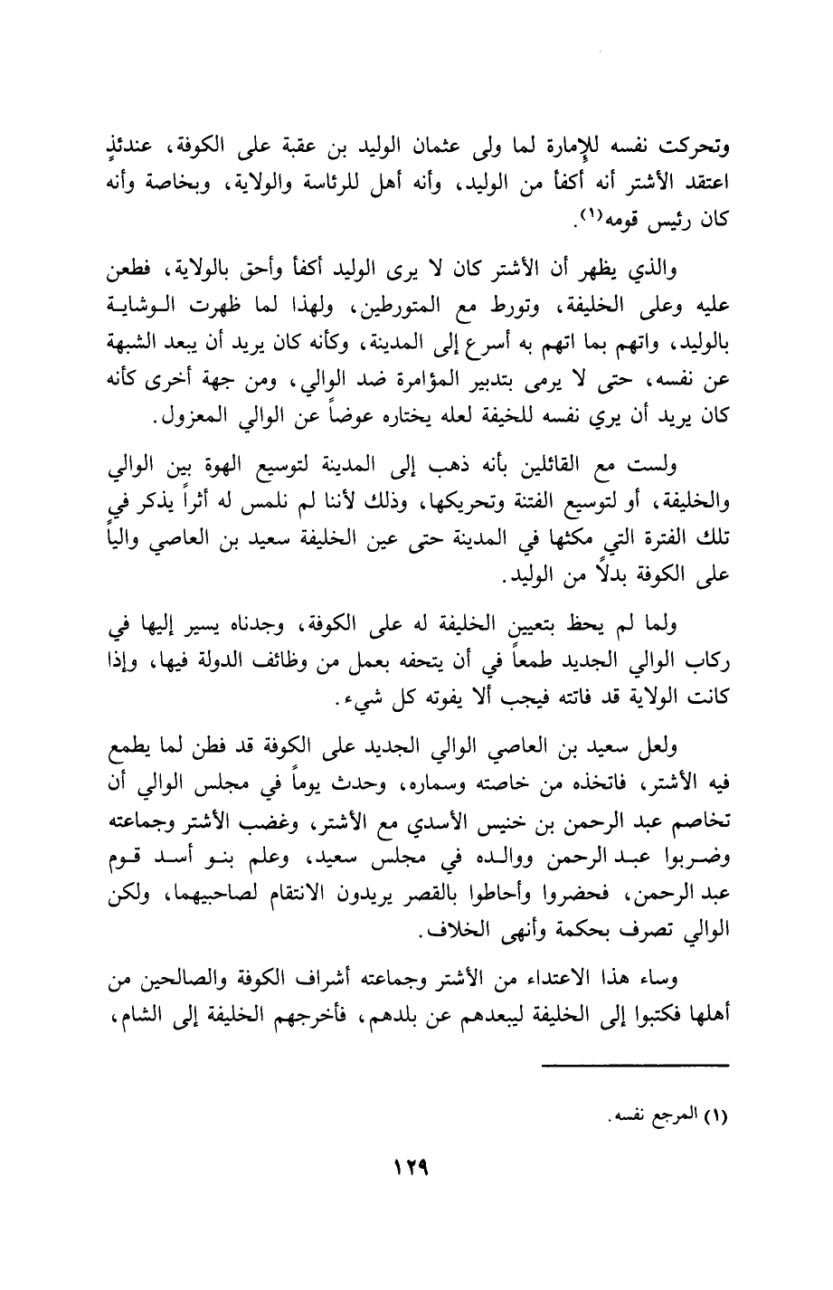 129…وتحركت نفسه للإمارة لما ولى عثمان الوليد بن عقبة على الكوفة، عندئذٍ اعتقد الأشتر أنه أكفأ من الوليد، وأنه أهل للرئاسة والولاية، وبخاصة وأنه كان رئيس قومه (1).