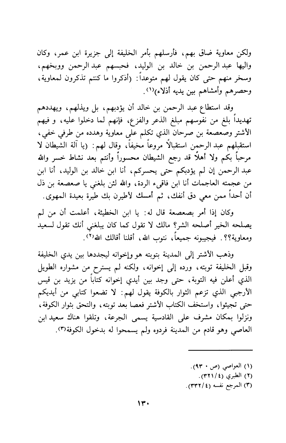 130…ولكن معاوية ضاق بهم، فأرسلهم بأمر الخليفة إلى جزيرة ابن عمر، وكان واليها عبد الرحمن بن خالد بن الوليد، فحبسهم عيد الرحمن ووبخهم، وسخر منهم حتى كان يقول لهم متوعداً: (أذكروا ما كنتم تذكرون لمعاوية، وحصرهم وأمشاهم بين يديه أذلاء) (1).