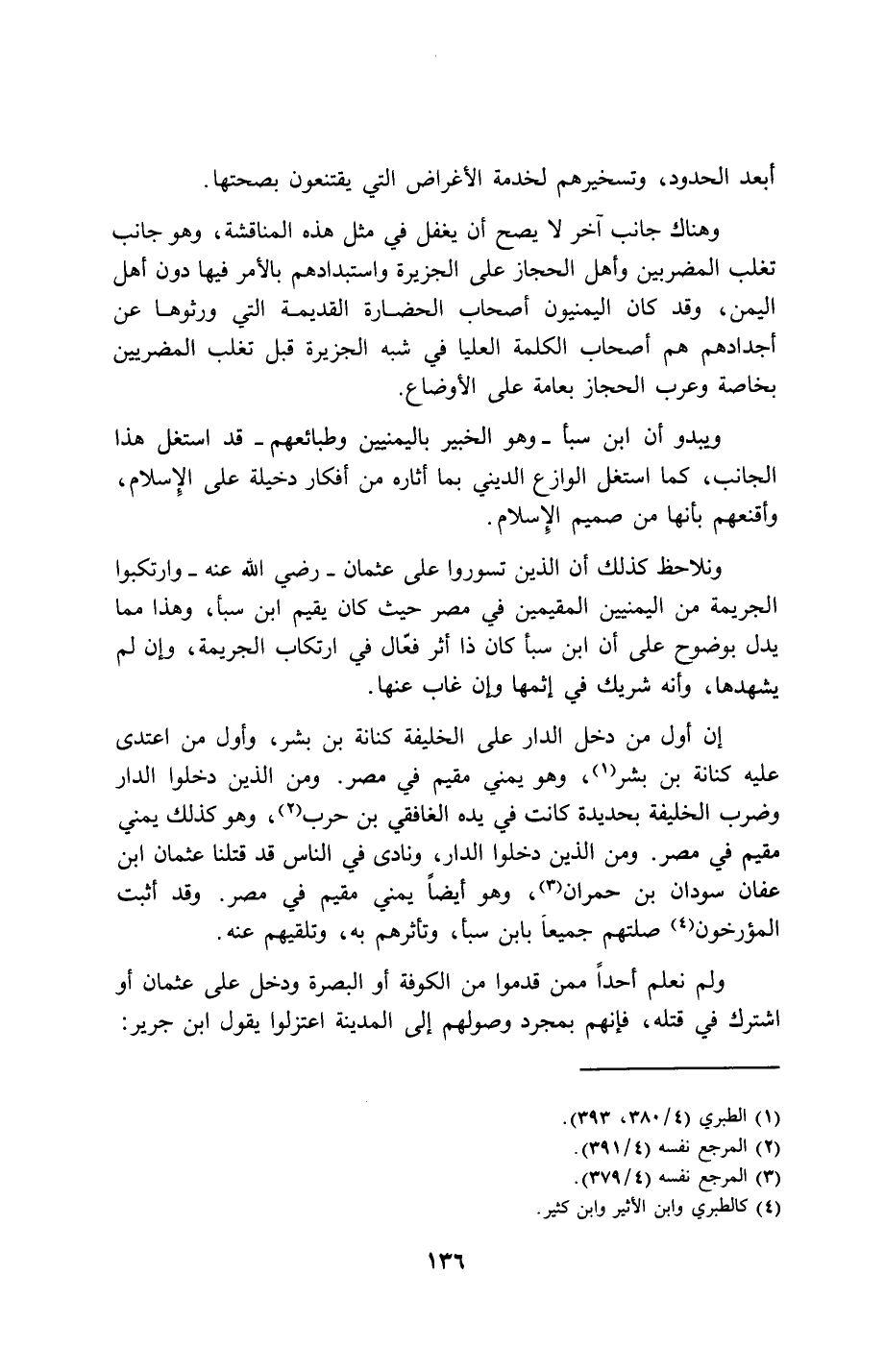 ونلاحظ كذلك أن الذين تسوروا على عثمان -رضي الله عنه- وارتكبوا الجريمة من اليمنيين المقيمين في مصر حيث كان يقيم ابن سبأ، وهذا مما يدل بوضوح على أن ابن سبأ كان ذا أثر فعّال في ارتكاب الجريمة، وإن لم يشهدها، وأنه شريك في إثمها وإن غاب عنها.