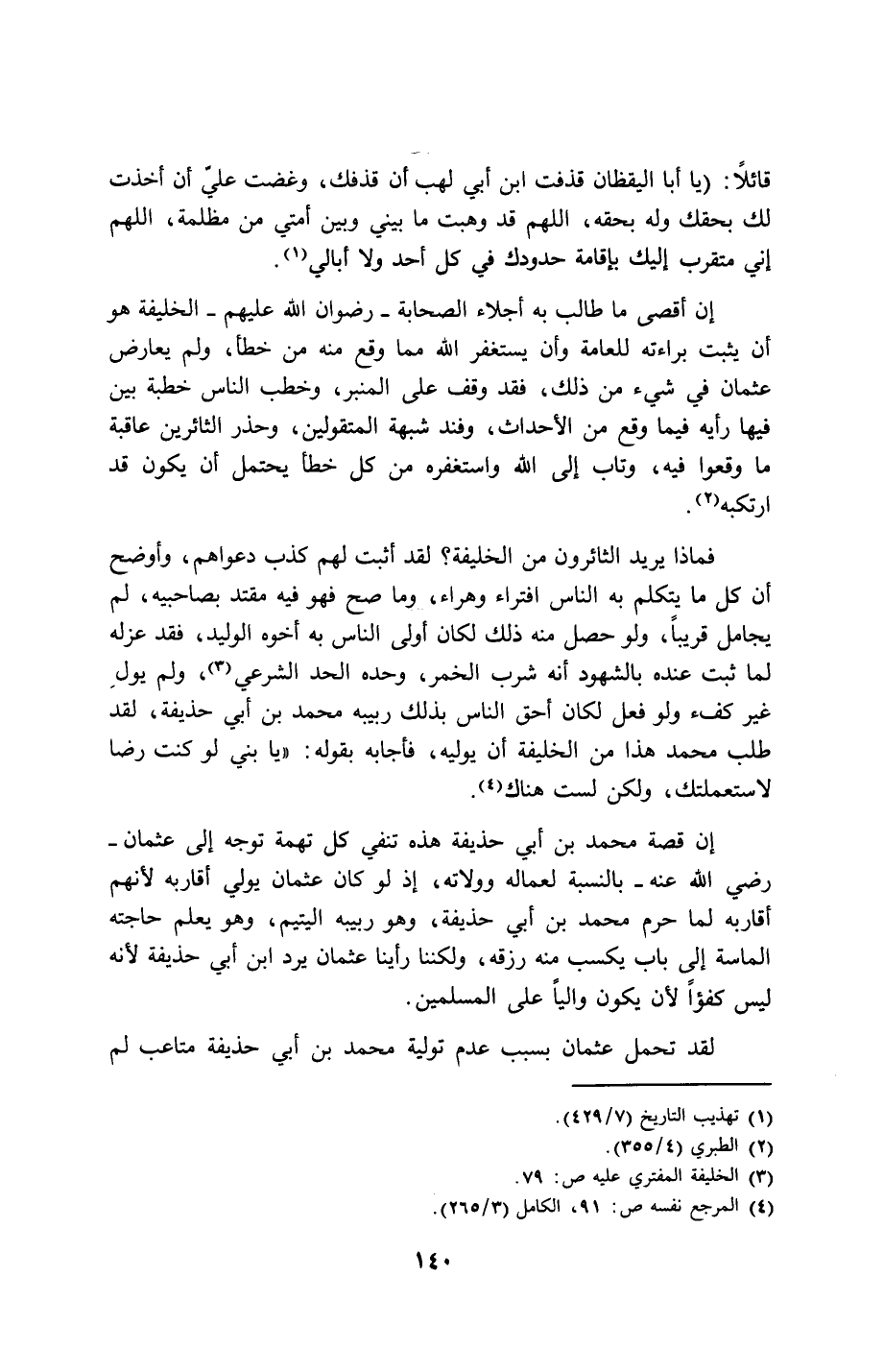 فماذا يريد الثائرون من الخليفة؟ لقد أثبت لهم كذب دعواهم، وأوضح أن كل ما يتكلم به الناس افتراء وهراء، وما صح فهو فيه مقتد بصاحبيه، لم يجامل قريباً، ولو حصل منه ذلك لكان أولى الناس به أخوه الوليد، فقد عزله لما ثبت عنده بالشهود أنه شرب الخمر، وحده الحد الشرعي (3)، ولم يولِ غير كفء ولو فعل لكان أحق الناس بذلك ربيبه محمد بن أبي حذيفة، لقد طلب محمد هذا من الخليفة أن يوليه، فأجابه بقوله: ((يا بني لو كنت رضا لاستعملتك، ولكن لست هناك (4).