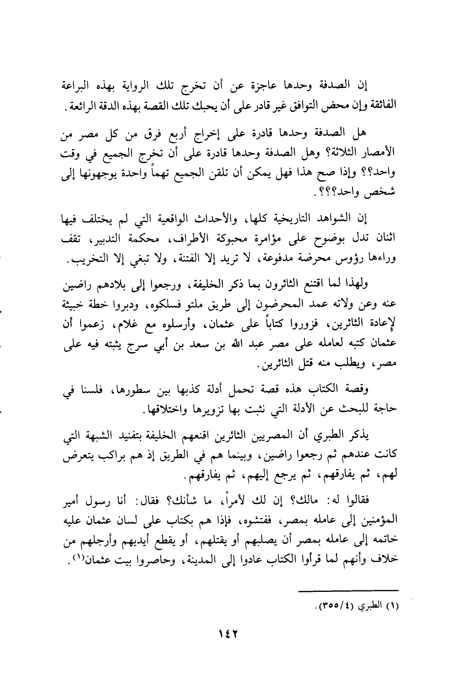 يذكر الطبري أن المصريين الثائرين اقنعهم الخليفة بتنفيذ الشبهة التي كانت عندهم ثم رجعوا راضين، وبينما هم في الطريق إذ هم براكب يتعرض لهم، ثم يفارقهم، ثم يرجع إليهم، ثم يفارقهم.
