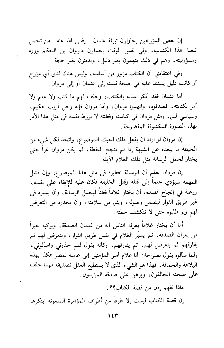 143…إن بعض المؤرخين يحاولون تبرئة عثمان -رضي الله عنه- من تحمل تبعة هذا الكتاب، وفي نفس الوقت يحملون مروان بن الحكم وزره ومسؤوليته، وهم في ذلك يتهمون بغير دليل، ويدينون بغير حجة.