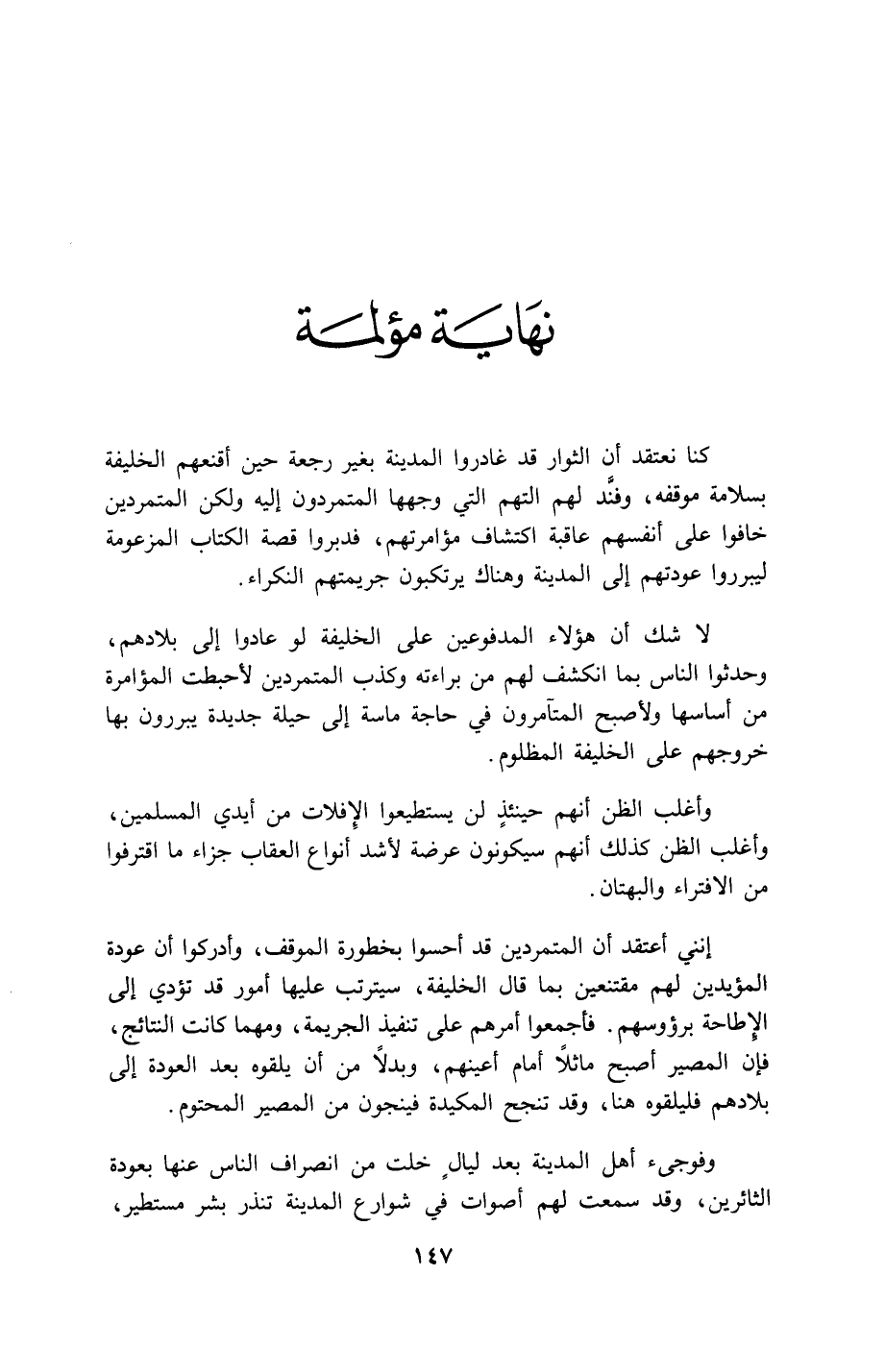 كنا نعتقد أن الثوار قد غادروا المدينة بغير رجعة حين أقنعهم الخليفة بسلامة موقفه، وفنَّد لهم التهم التي وجهها المتمردون إليه ولكن المتمردين خافوا على أنفسهم عاقبة اكتشاف مؤامرتهم، فدبروا قصة الكتاب المزعومة ليبرروا عودتهم إلى المدينة وهناك يرتكبون جريمتهم النكراء.