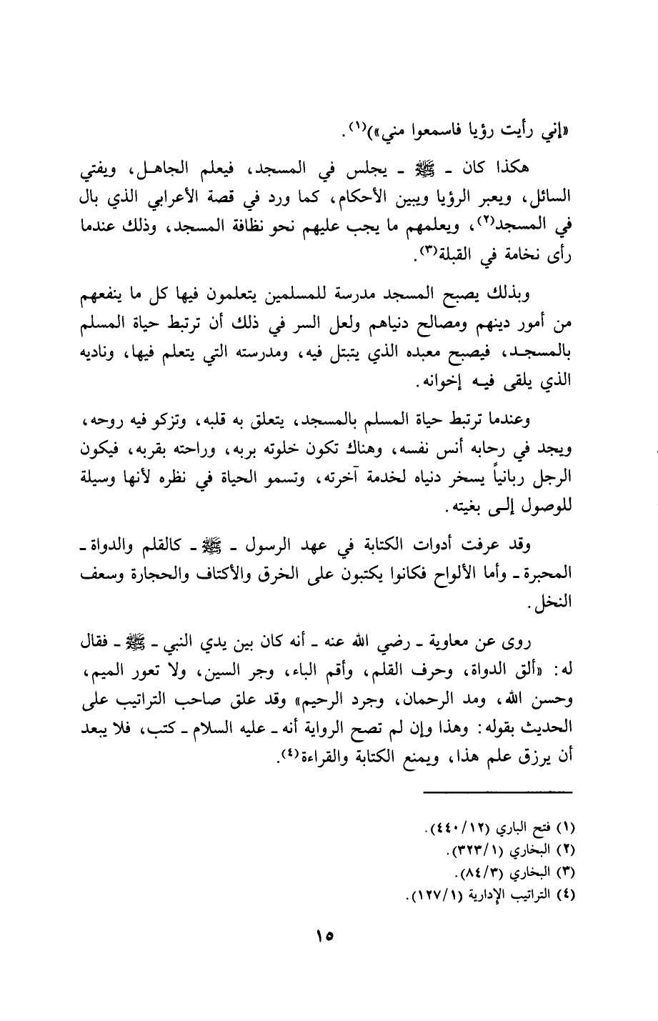 هكذا كان - صلى الله عليه وسلم - يجلس في المسجد، فيعلم الجاهل، ويفتي السائل، ويعبر الرؤيا ويبين الأحكام، كما ورد في قصة الأعرابي الذي بال في المسجد (2)، ويعلمهم ما يجب عليهم نحو نظافة المسجد، وذلك عندما رأى نخامة في القبلة (3).