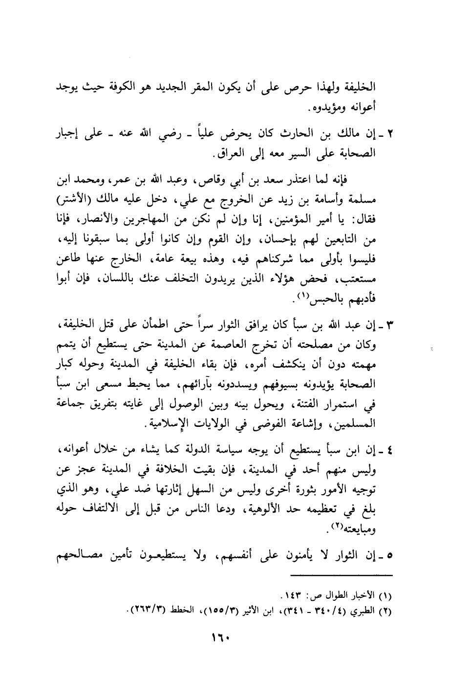 160…الخليفة ولهذا حرص على أن يكون المقر الجديد هو الكوفة حيث يوجد أعوانه ومؤيدوه.
