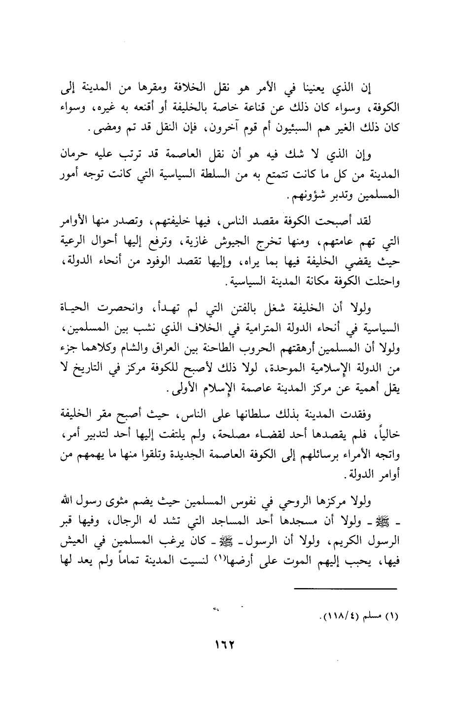 162…إن الذي يعنينا في الأمر هو نقل الخلافة ومقرها من المدينة إلى الكوفة، وسواء كان ذلك عن قناعة خاصة بالخليفة أوأقنعه به غيره، وسواء كان ذلك الغير هم السبئيون أم قوم آخرون، فإن النقل قد تم ومضى.