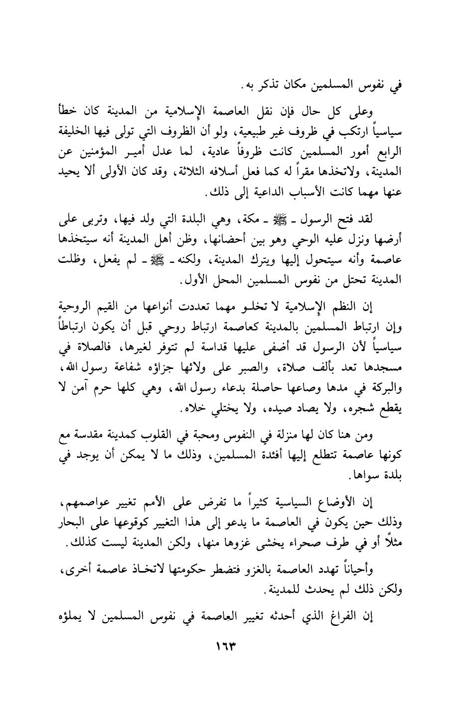 إن النظم الإسلامية لا تخلو مهما تعددت أنواعها من القيم الروحية وإن ارتباط المسلمين بالمدينة كعاصمة ارتباط روحي قبل أن يكون ارتباطاً سياسياً لأن الرسول قد أضفى عليها قداسة لم تتوفر لغيرها، فالصلاة في مسجدها تعد بألف صلاة، والصبر على ولائها جزاؤه شفاعة رسول الله، والبركة في مدها وصاعها حاصلة بدعاء رسول الله، وهي كلها حرم آمن لا يقطع شجره، ولا يصاد صيده، ولا يختلي خلاه.