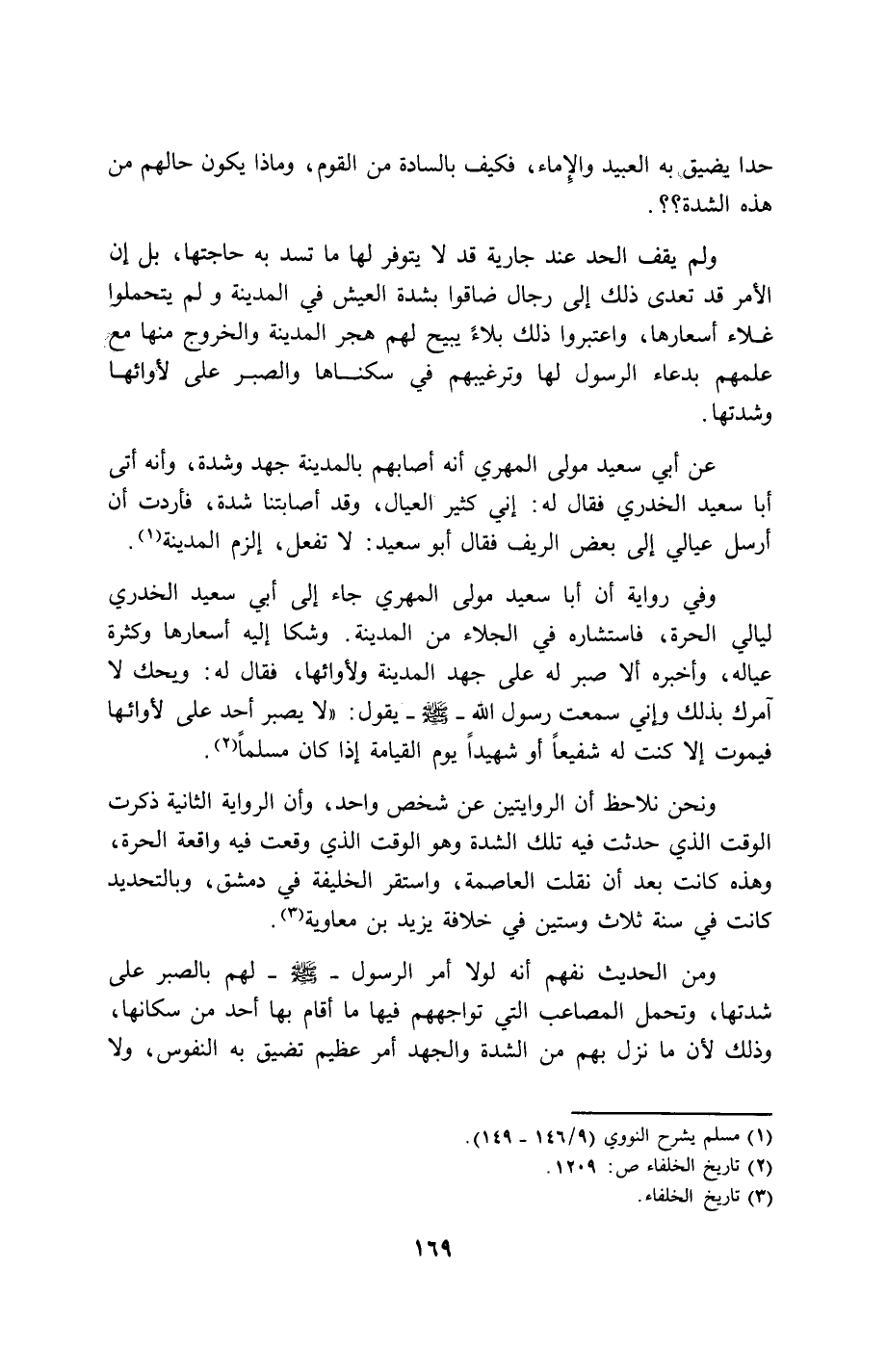 عن أبي سعيد مولى المهري أنه أصابهم بالمدينة جهد وشدة، وأنه أتى أبا سعيد الخدري فقال له: إني كثير العيال، وقد أصابتنا شدة، فأردت أن أرسل عيالي إلى بعض الريف فقال أبو سعيد: لآ تفعل، إلزم المدينة (1).