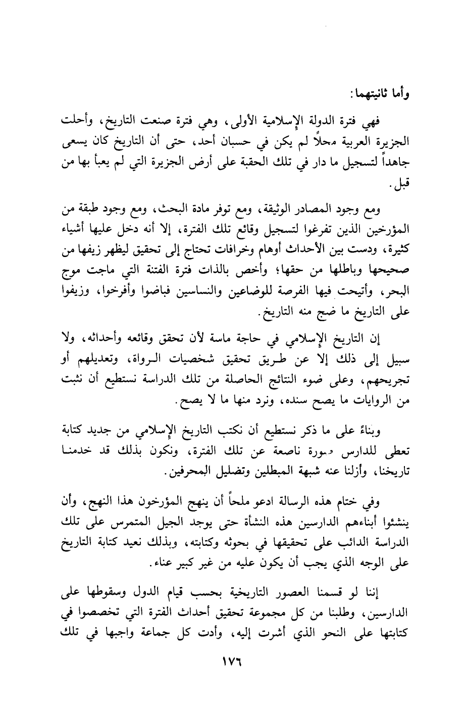 وفي ختام هذه الرسالة ادعوا ملحاً أن ينهج المؤرخون هذا النهج، وأن ينشئوا أبناءهم الدارسين هذه النشأة حتى يوجد الجيل المتمرس على تلك الدراسة الدائب على تحقيقها في بحوثه وكتابته، وبذلك نعيد التاريخ على الوجه الذي يجب أن يكون عليه من غير كبير عناء.