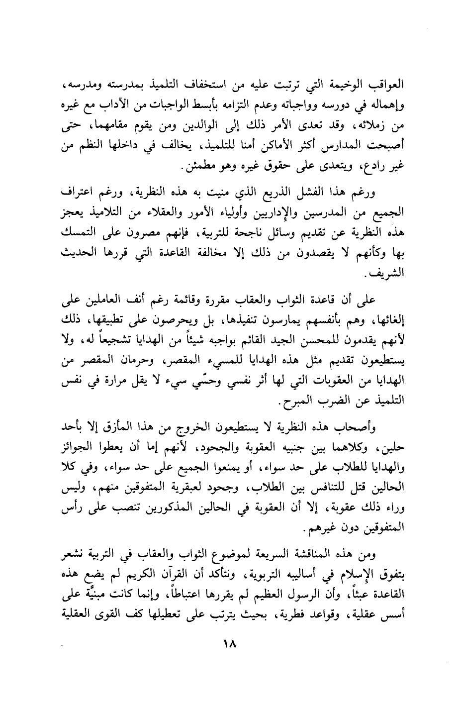 18…العواقب الوخيمة التي ترتبت عليه من استخفاف التلميذ بمدرسته ومدرسه، وإهماله في دروسه وواجباته وعدم التزامه بأبسط الواجبات من الآداب مع غيره من زملائه، وقد تعدى الأمر ذلك إلى الوالدين ومن يقوم مقامهما، حتى أصبحت المدارس أكثر الأماكن أمناً للتلميذ، يخالف في داخلها النظم من غير رادع، ويتعدى على حقوق غيره وهو مطمئن.