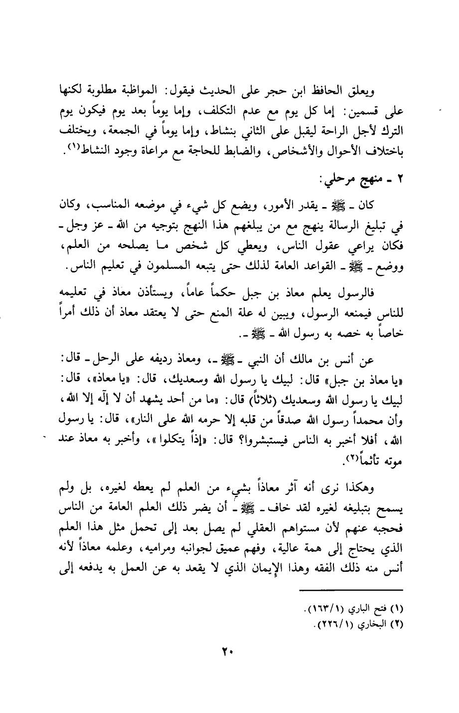 وهكذا نرى أنه آثر معاذاً بشيء من العلم لم يعطه لغيره، بل ولم يسمح بتبليغه لغيره، بل ولم يسمح بتبليغه لغيره فقد خاف - صلى الله عليه وسلم - أن يضر ذلك العلم العامة من الناس فحجبه عنهم لأن مستواهم العقلي لم يصل بعد إلى تحمل مثل هذا العلم الذي يحتاج إلى همة عالية، وفهم عميق لجوانبه ومراميه، وعلمه معاذاً لأنه أنس منه ذلك الفقه وهذا الإيمان الذي لا يقعد به عن العمل به يدفعه إلى…