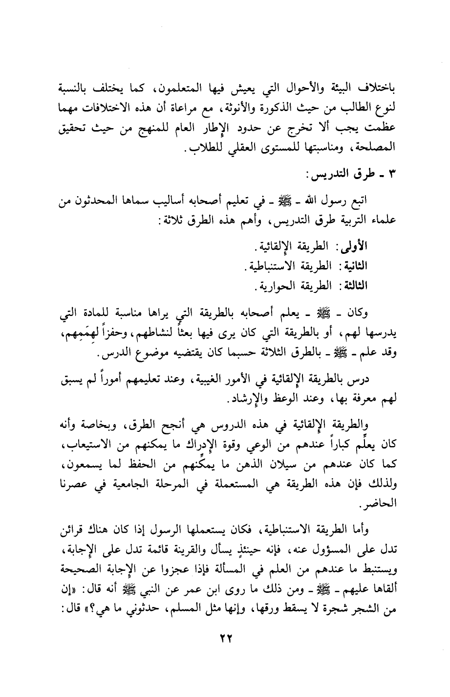 وكان - صلى الله عليه وسلم - يعلم أصحابه بالطريقة التي يراها مناسبة للمادة التي يدرسوها لهم، أو بالطريقة التي كان يرى فيها بعثاً لنشاطهم، وحفزا لهِمَمِهم، وقد علم - صلى الله عليه وسلم - بالطرق الثلاثة حسبما كان يقتضيه موضوع الدرس.