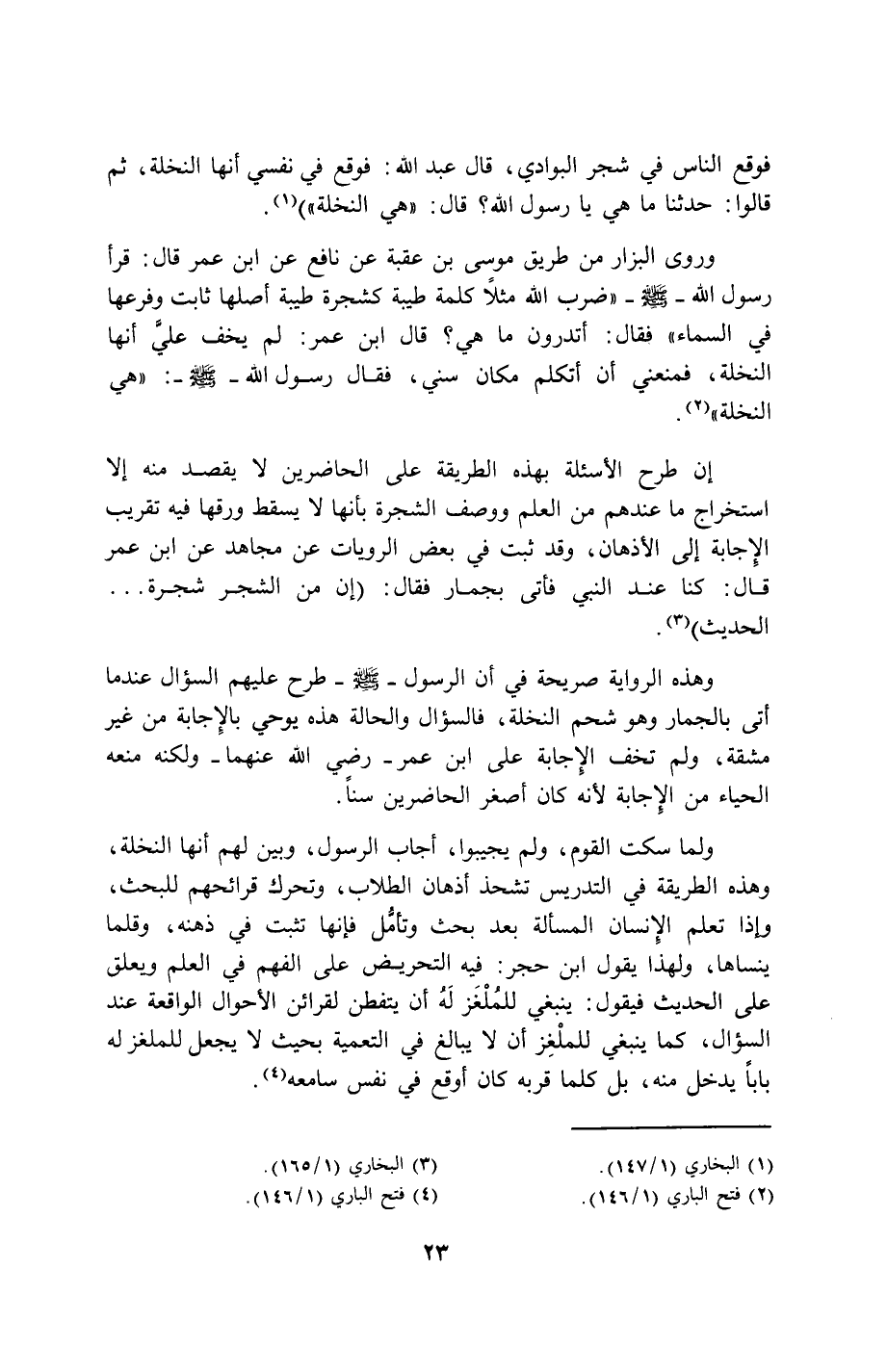 ولما سكت القوم، ولم يجيبوا، أجاب الرسول، وبين لهم أنها النخلة، وهذه الطريقة في التدريس تشحذ أذهان الطلاب، وتحرك قرائحهم للبحث، وإذا تعلم الإنسان المسألة بعد بحث وتأمُّل فإنها تثبت في ذهنه، وقلما ينساها، ولهذا يقول ابن حجر: فيه التحريض على الفهم في العلم ويعلق على الحديث فيقول: ينبغي للمُلْغَز لَهُ أن يتفطن لقرائن الأحوال الواقعة عند السؤال، كما ينبغي للملْغِز أن لا يبالغ في التعمية بحيث لا يجعل للملغز له باباً يدخل منه، بل كلما قربه كان أوقع في نفس سامعه (4).