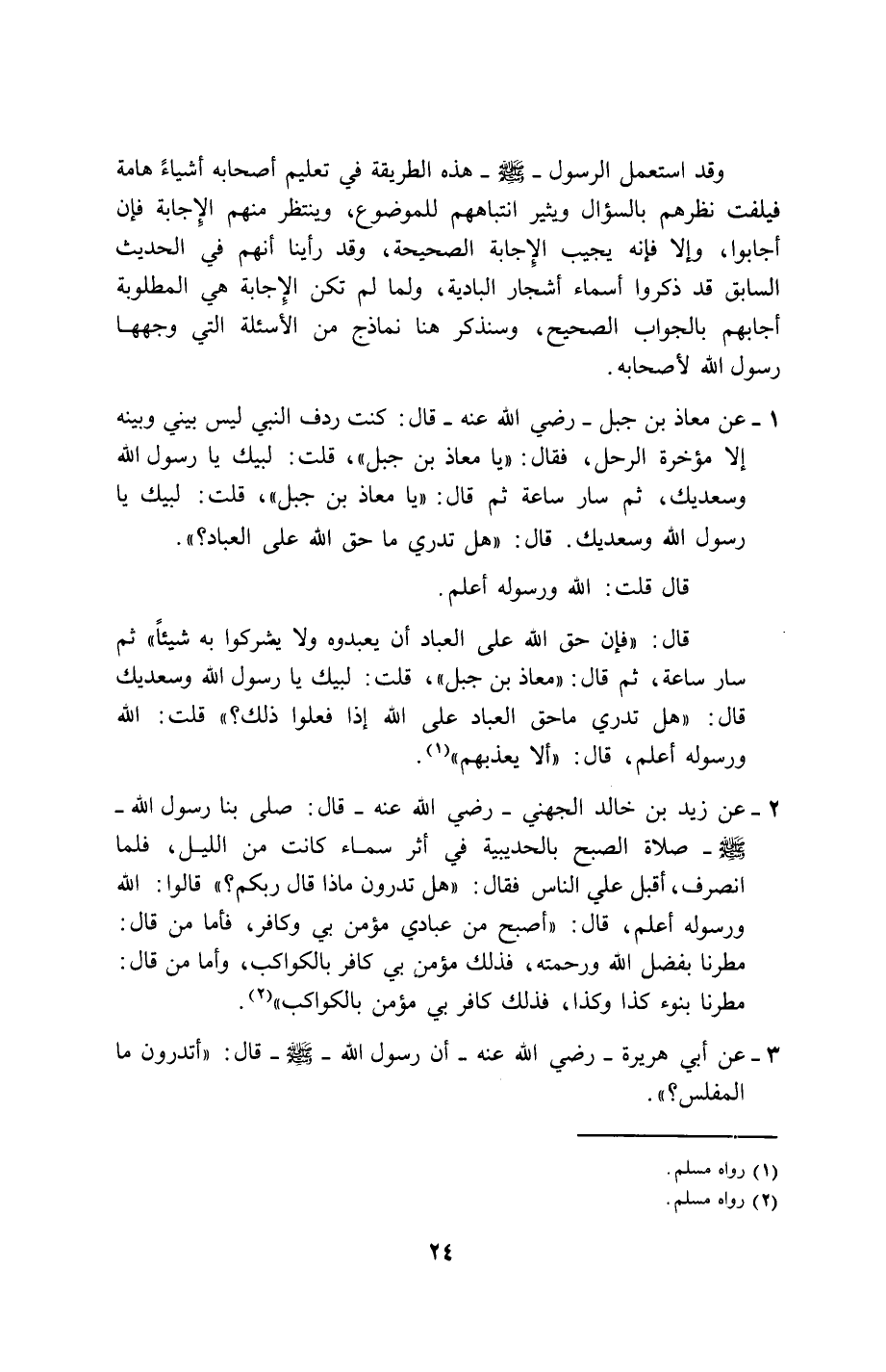 24…وقد استعمل الرسول - صلى الله عليه وسلم - هذه الطريقة في تعليم أصحابه أشياءً هامة فيلفت نظرهم بالسؤال ويثير انتباههم للموضوع، وينتظر منهم الإجابة فإن أجابوه، وإلا فإنه يجيب الإجابة الصحيحة، وقد راينا أنهم في الحديث السابق قد ذكروا أسماء أشجار البادية، ولما لم تكن الإجابة هي المطلوبة أجابهم بالجواب الصحيح، وسنذكر هنا نماذج من الأسئلة التي وجهها رسول الله لأصحابه.