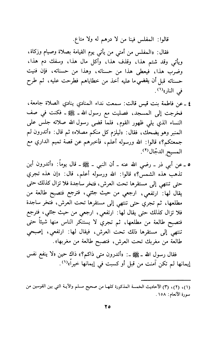 … (1)، (2)، (3) الأحاديث الخمسة المذكورة كلها من صحيح مسلم والآية التي بين القوسين من سورة الأنعام: 158.