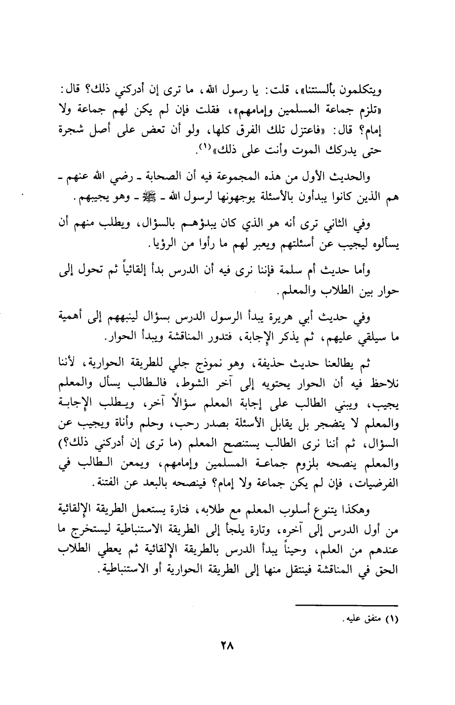 ثم يطالعنا حديث حذيفة، وهو نموذج جلي للطريقة الحوارية، لأننا نلاحظ فيه أن الحوار يحتويه إلى آخر الشوط، فالطالب يسأل والمعلم يجيب، ويبني الطالب على إجابة المعلم سؤالاً آخر، ويطلب الإجابة والمعلم لا يتضجر بل يقابل الأسئلة بصدر رحب، وحلم واناة ويجيب عن السؤال، ثم أننا نرى الطالب يستنصح المعلم (ما ترى إن أدركني ذلك؟) والمعلم ينصحه بلزوم جماعة المسلمين وإمامهم، ويمعن الطالب في الفرضيات، فإن لم يكن جماعة ولا إمام؟ فينصحه بالبعد عن الفتنة.