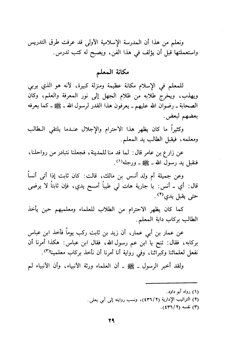 29…ونعلم من هذا أن المدرسة الإسلامية الأولى قد عرفت طرق التدريس واستعملتها قبل أن يؤلف في هذا الفن، ويصبح له كتب تدرس.